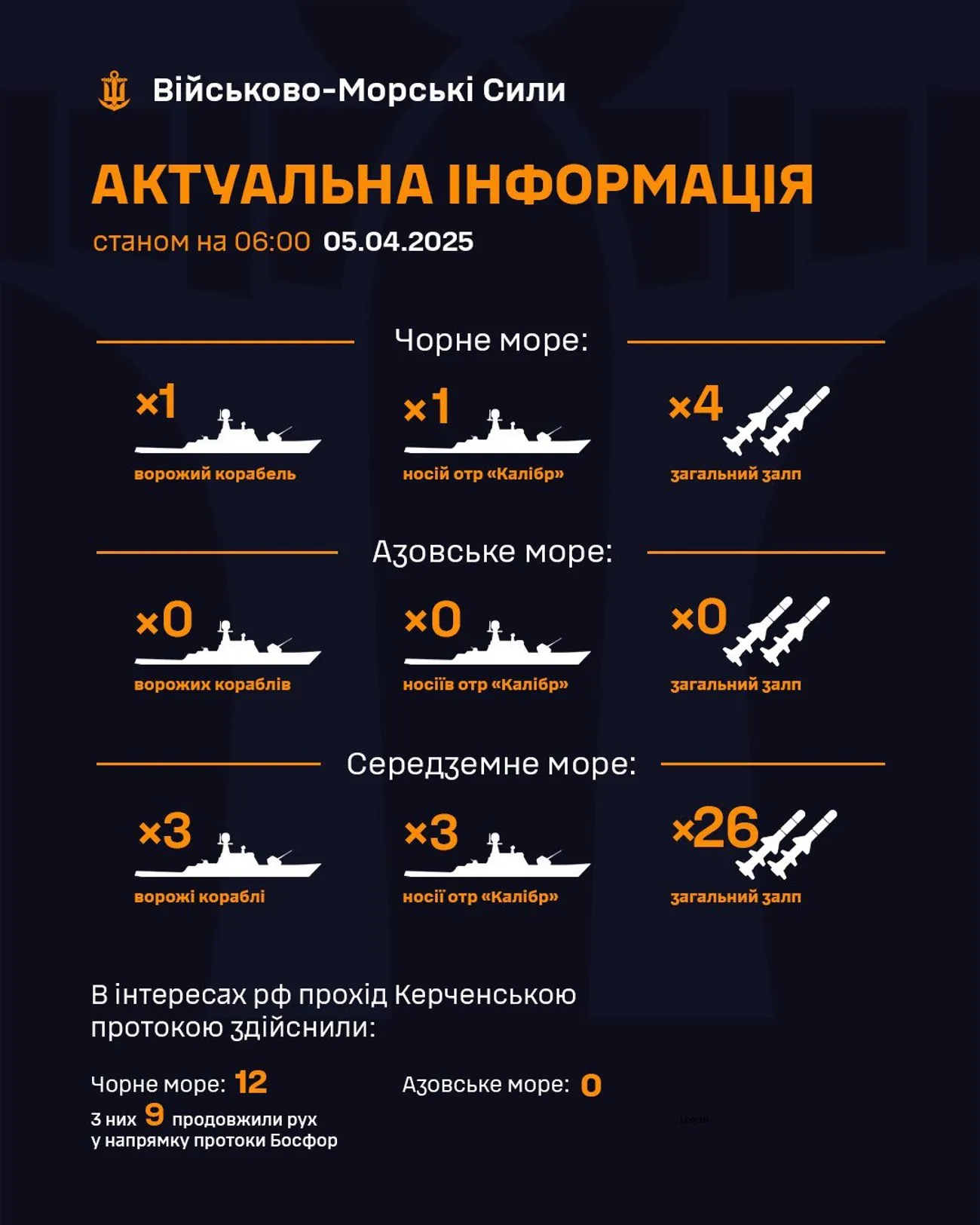 Зазначається, що станом на 06:00 суботи, 5 квітня, в акваторії Чорного і Середземного морів фіксуються ворожі кораблі.