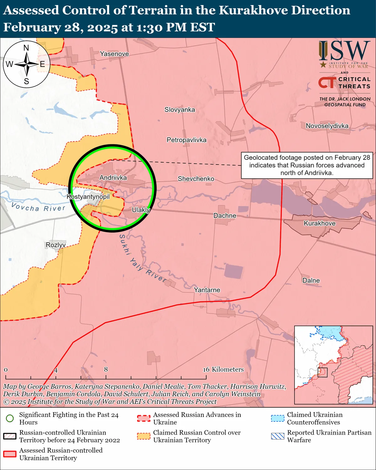 27 і 28 лютого війська рф наступали на захід від Курахового в районі Костянтинополя та Андріївки.