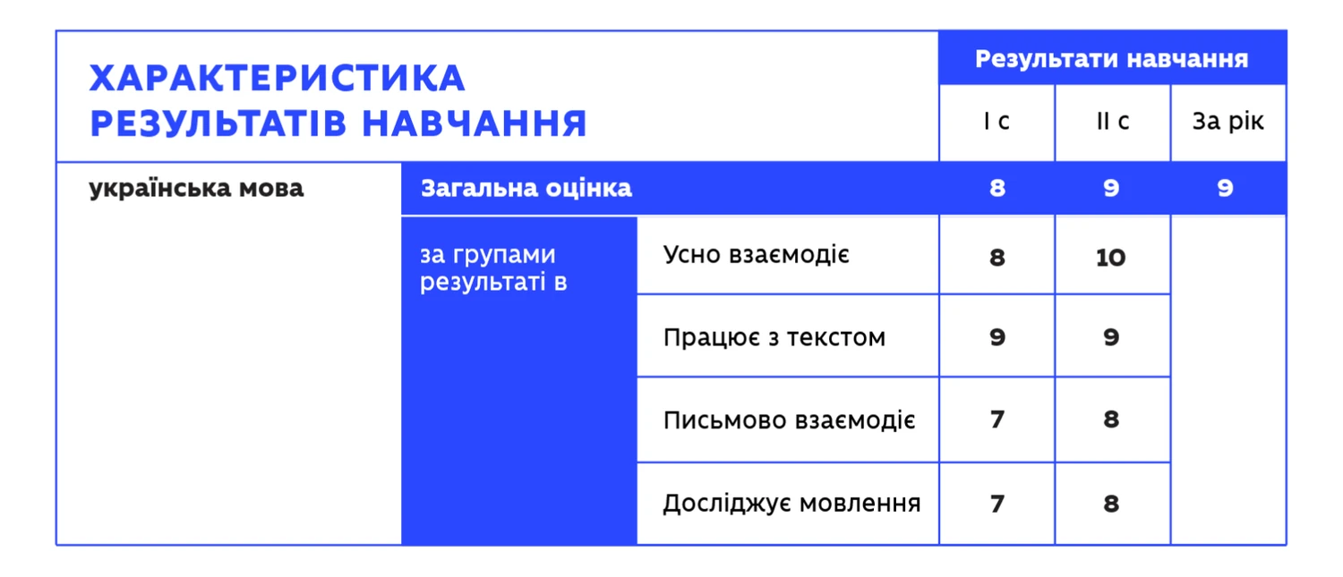 Як приклад у МОН наводять свідоцтво з предмета "Українська мова", де чотири оцінки, які дають докладнішу картину щодо вмінь дитини сприймати тексти, спілкуватися усно й письмово, аналізувати прочитане тощо.