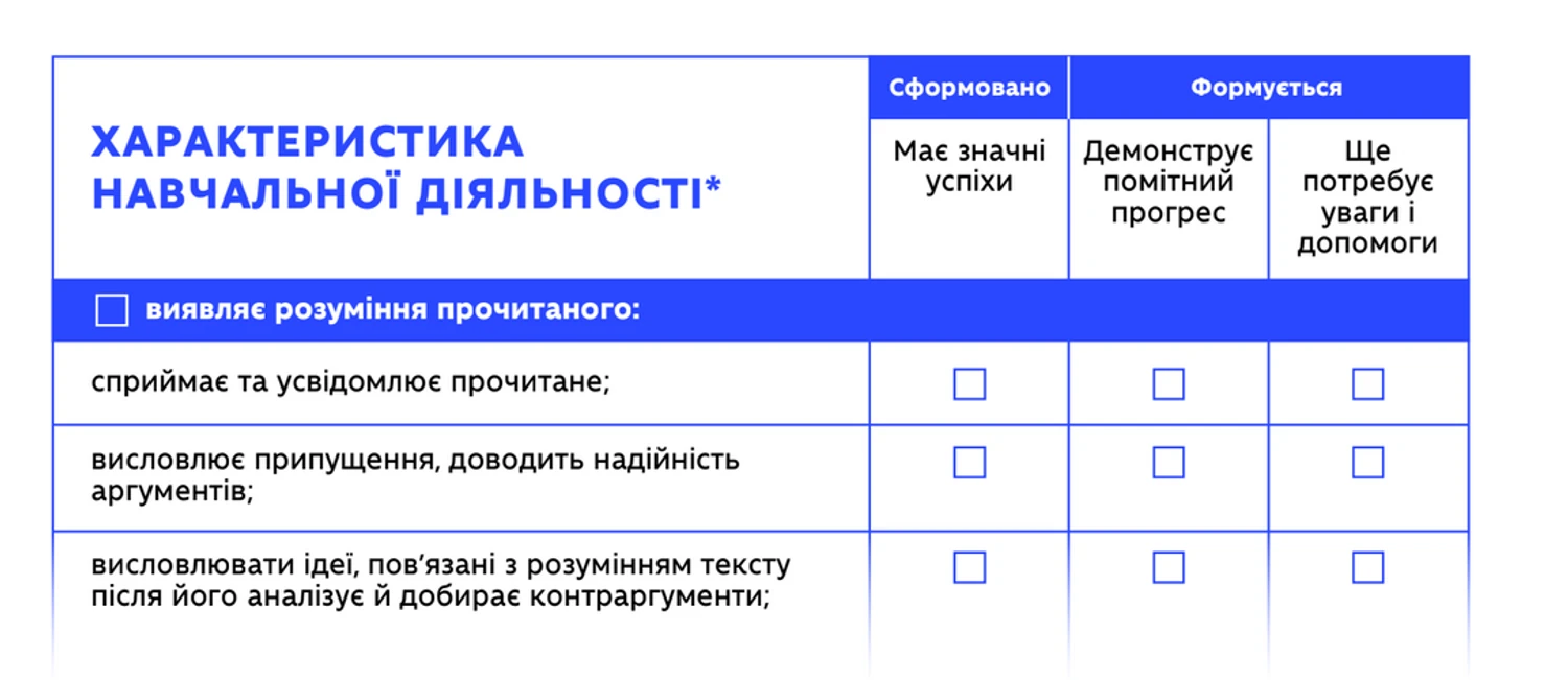 Щоб отримати більше інформації про результати дитини в навчанні, у свідоцтві досягнень НУШ (на відміну від табеля) зафіксовано оцінки за групами результатів.