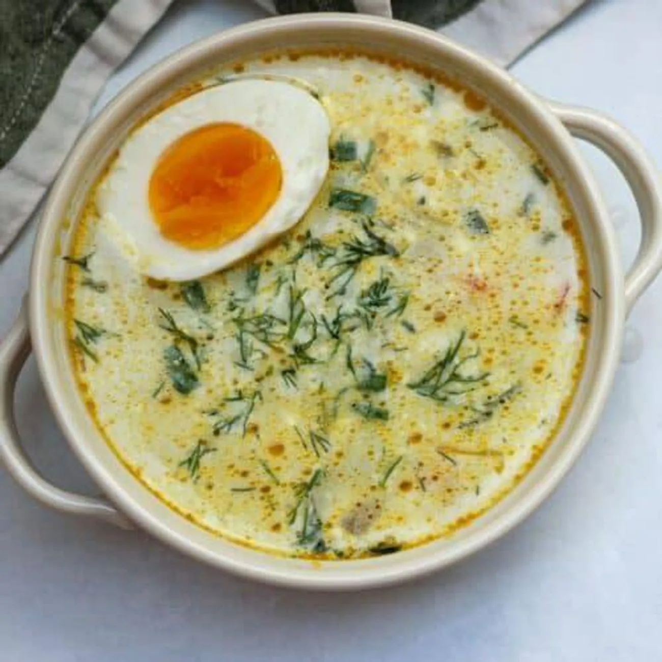 Подавати зелений борщ можна вареним яйцем і ложкою сметани.