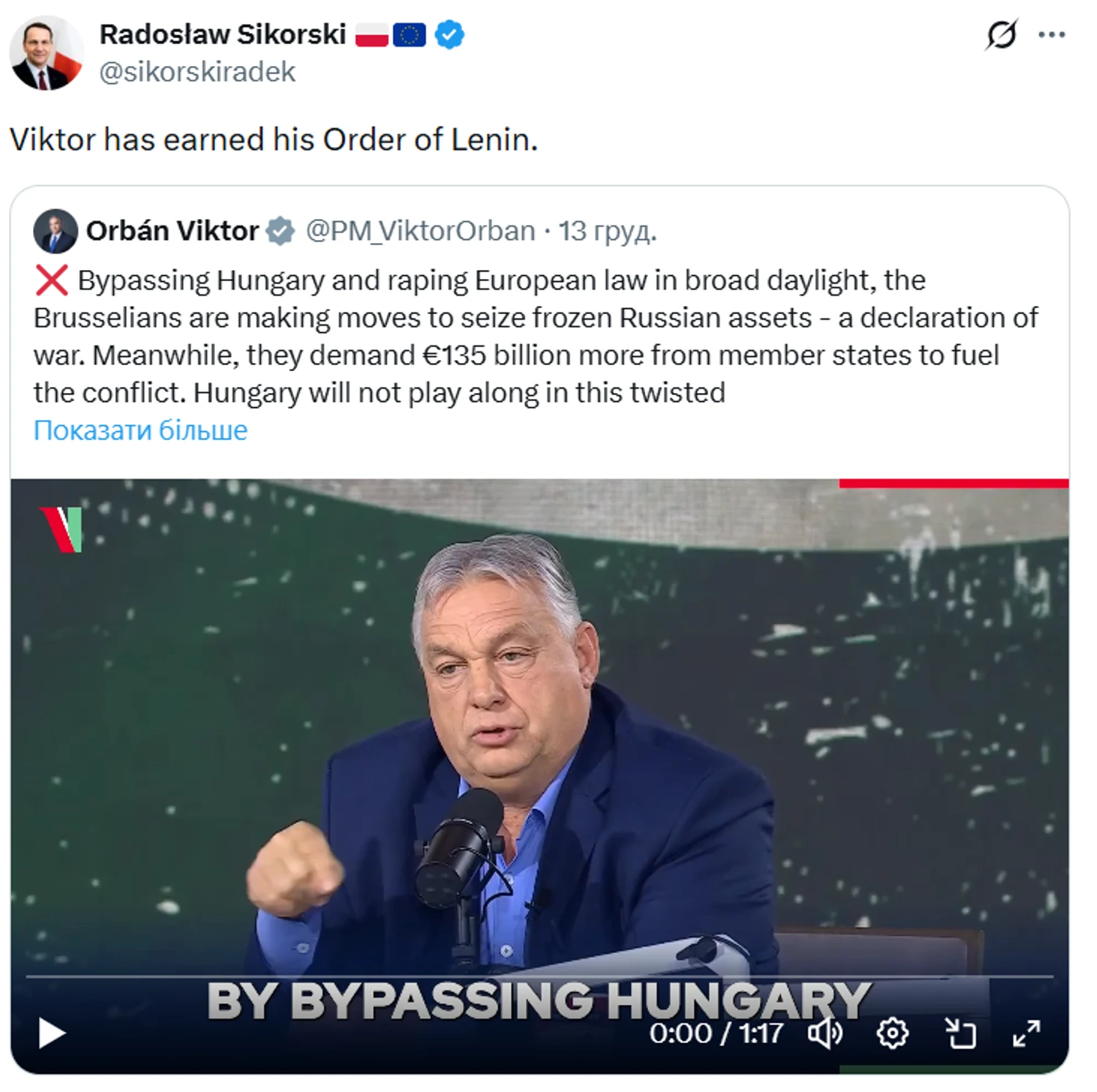 Прем'єр-міністр Угорщини Віктор Орбан заявив, що йому вдалося запобігти "оголошенню війни росії" через виділення Україні 90 млрд євро кредиту. У відповідь міністр закордонних справ Польщі Радослав Сікорський іронічно "нагородив" Орбана орденом леніна.