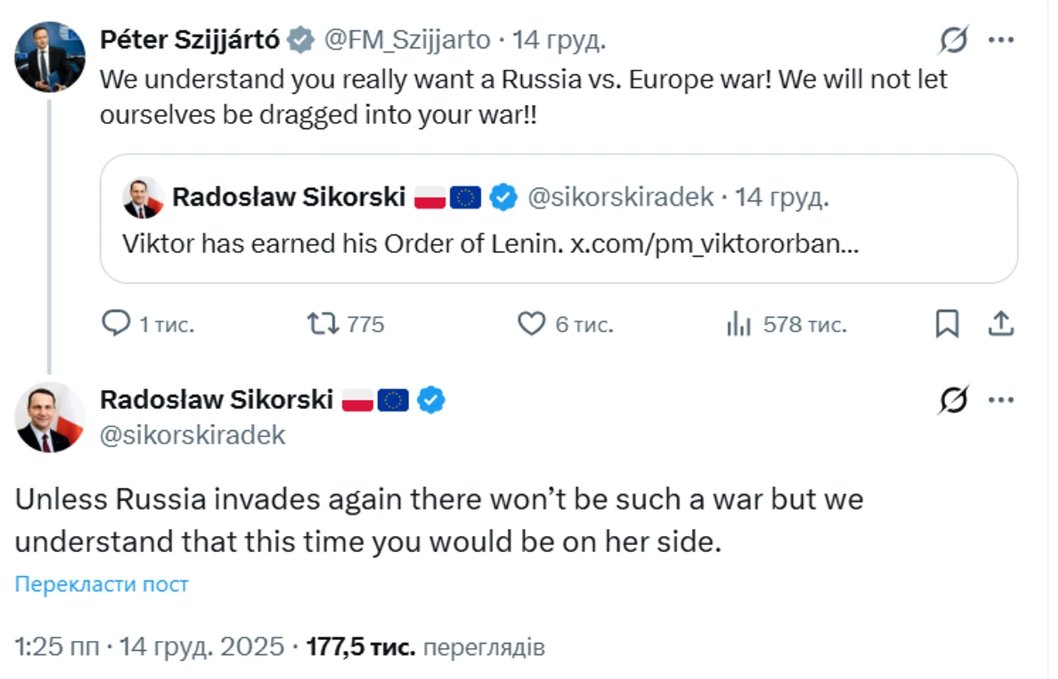 Прем’єр-міністр Угорщини Віктор Орбан написав допис в Х, в якому прокоментував виділення Україні 90 млрд євро кредиту, зазначивши, що завдяки тому, що лідери країн ЄС поки не змогли погодити репараційний кредит для України коштом заморожених російських активів, вдалося уникнути "оголошення війни росії". На слова Орбана відреагував глава МЗС Польщі Радослав Сікорський, надіславши прем’єру фото ордена Леніна, передає УНН.