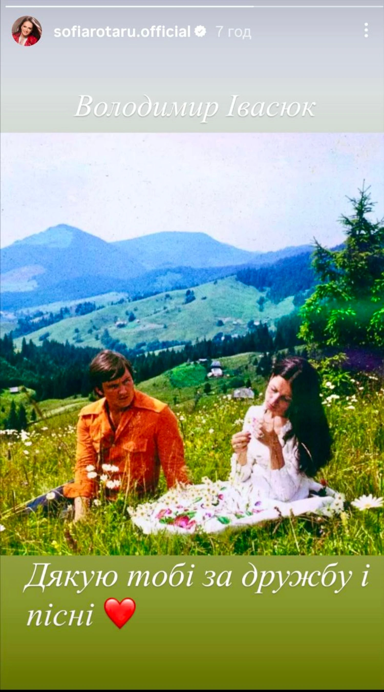 В Instagram-stories артистка опублікувала архівне фото, на якому вона зображена разом із автором безсмертних хітів на тлі карпатських краєвидів. Світлину вона підписала лаконічно та зворушливо: "Володимир Івасюк" і додала слова вдячності: "Дякую тобі за дружбу і пісні".