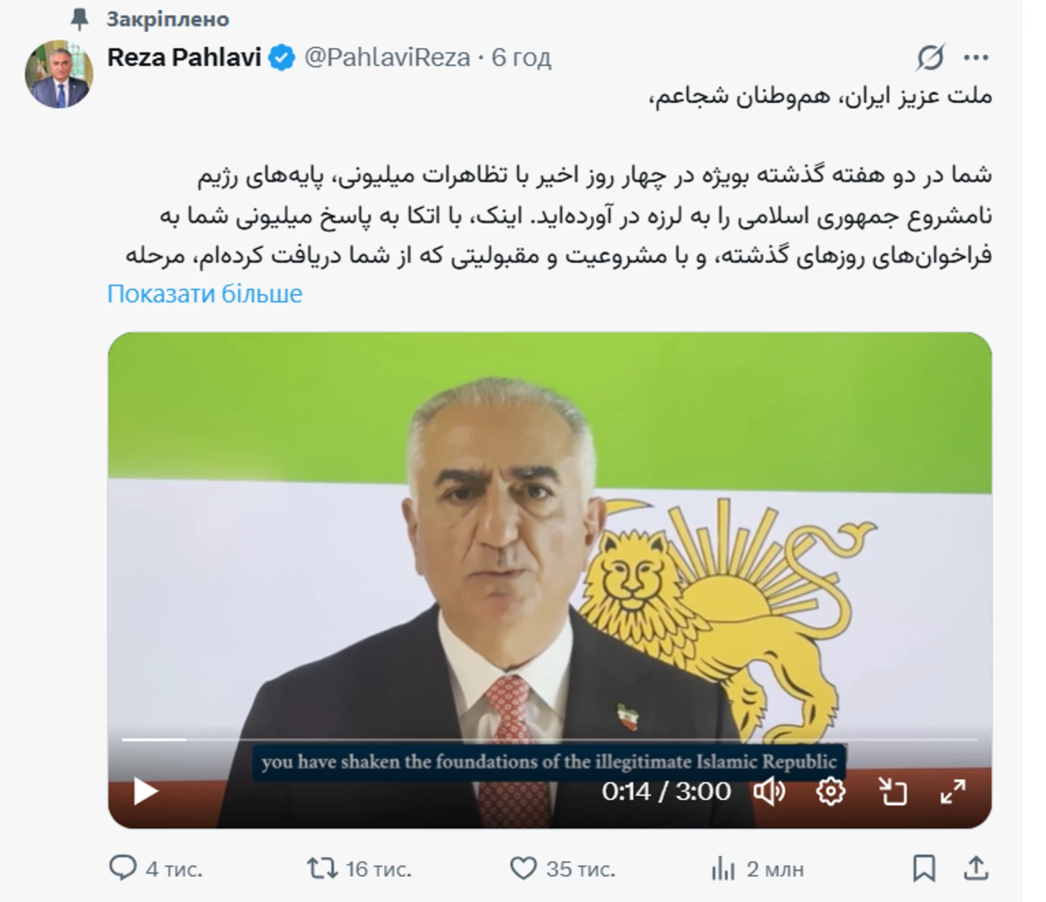 Спадкоємець престолу також запевнив іранців, що вони не самотні у своїй боротьбі, та анонсував швидке надходження широкої міжнародної підтримки. Наразі ситуація в Ірані залишається критичною, а протести охоплюють дедалі більше регіонів країни.