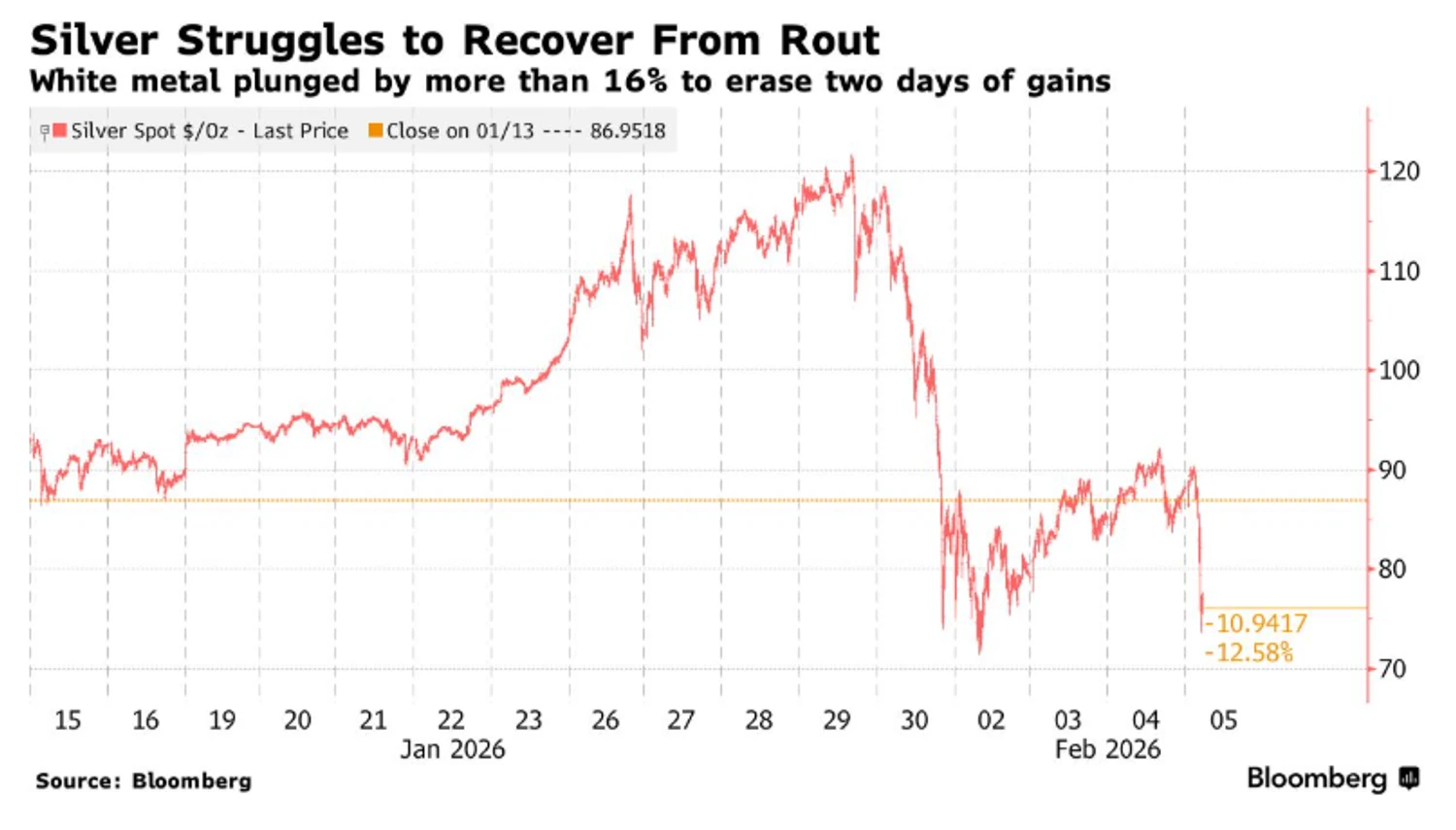 Ціна на срібло впала на 17% 5 лютого, нівелюючи дводенне відновлення, а золото знизилося на 3,5%. Падіння пов'язане з масовим виходом з позицій через погіршення настроїв та невизначеність навколо ФРС.
