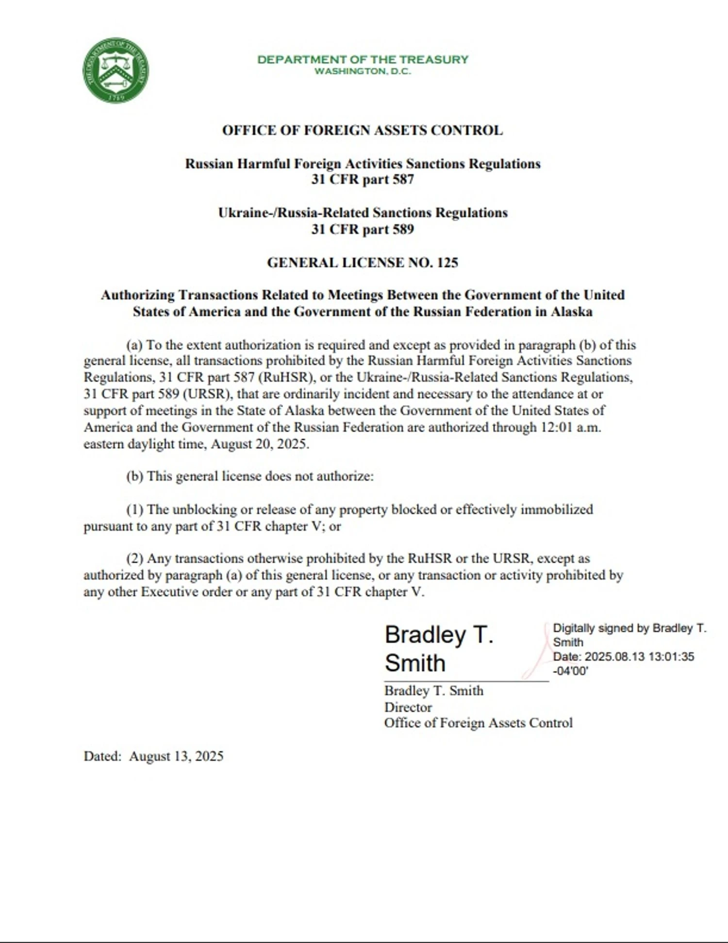 Управління контролю за іноземними активами (OFAC) Міністерства фінансів США видає пов'язану з росією Генеральну ліцензію 125 "На дозвіл на операції, пов'язані із зустрічами між урядом Сполучених Штатів Америки та урядом Російської Федерації на Алясці