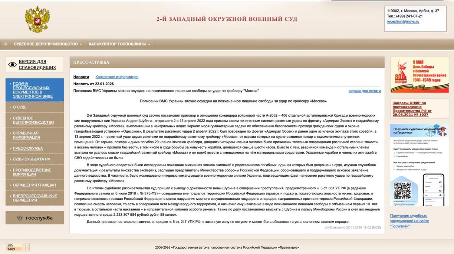 Як звернула увагу "Медіазона", 2-й Західний окружний військовий суд, розташований у москві, виніс заочний вирок у справі про затоплення крейсера. До довічного терміну заочно засудили командира 406 артилерійської бригади ВМС України Андрія Шубіна, який, за версією російського слідства, наказав завдати ракетних ударів по крейсеру "Москва" і фрегату "Адмірал Ессен" (він був атакований 2 квітня 2022 року). Російський суд також ухвалив стягнути з українського військового 2,2 мільярда рублів.