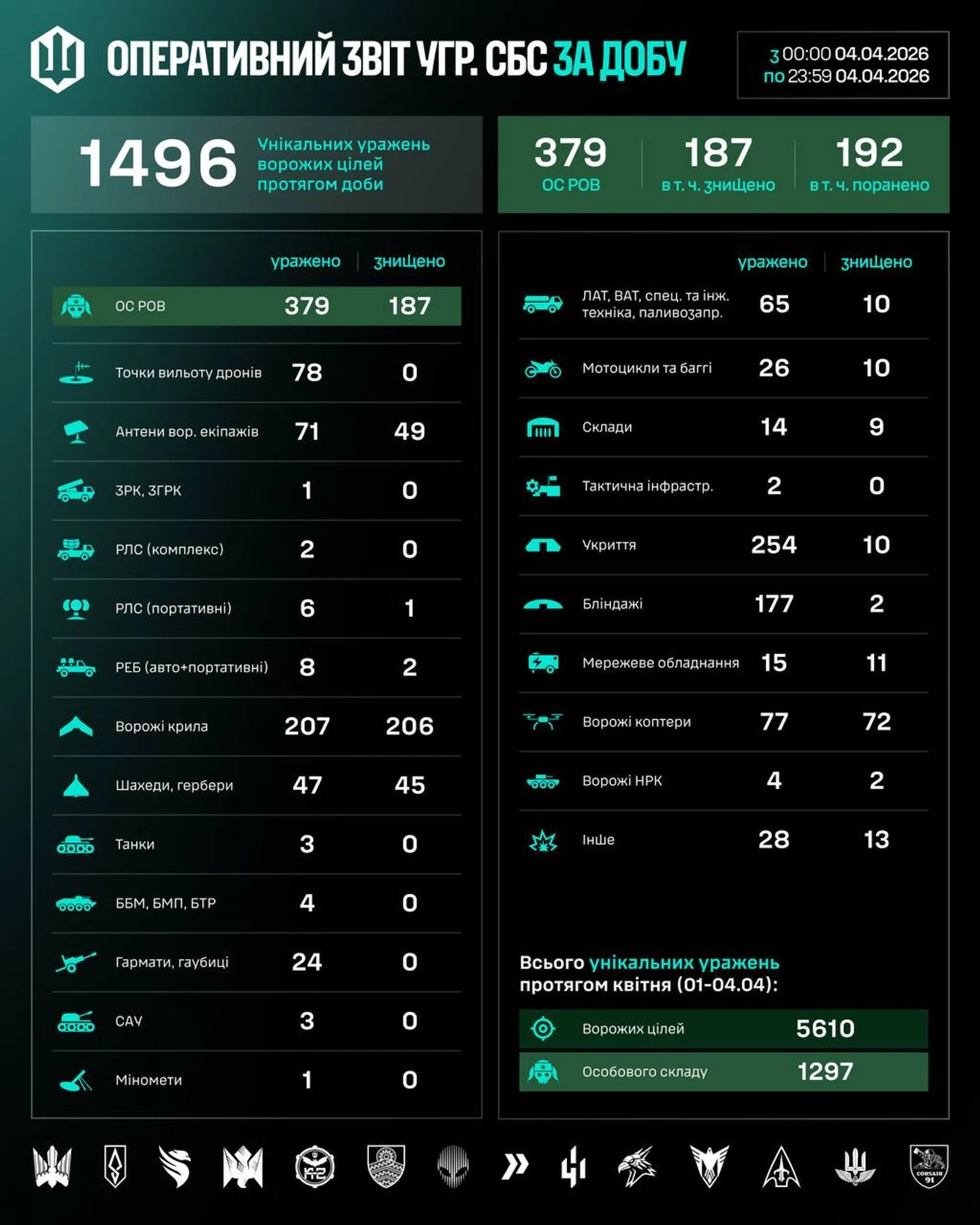 Підрозділи СБС знищили 1496 цілей, включаючи 187 окупантів та 331 безпілотник. За чотири дні квітня загальна кількість уражень сягнула 5610 об'єктів.