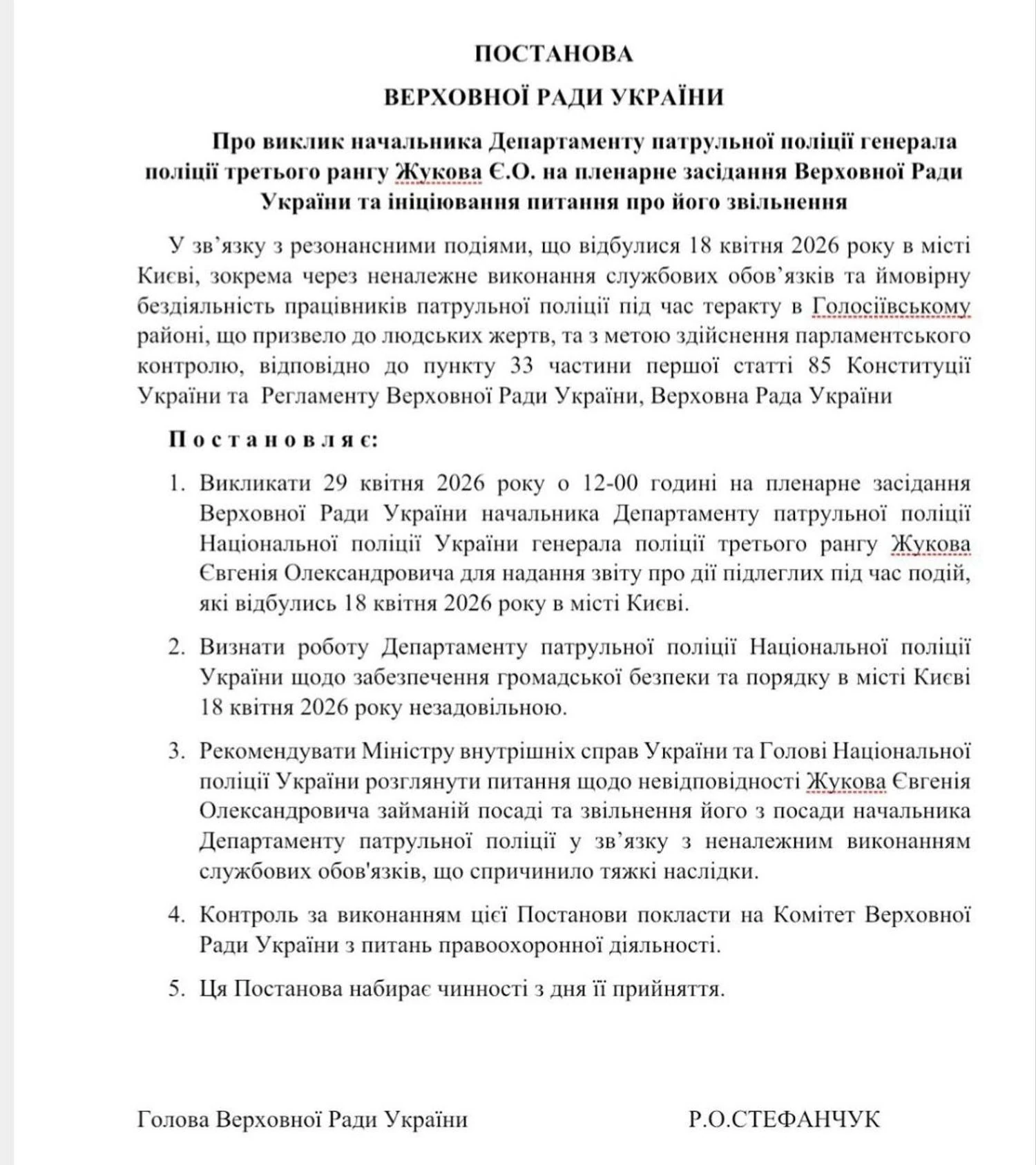 Згідно з документом, Жуков має з’явитися до Верховної Ради 29 квітня о 12:00 та доповісти про дії працівників патрульної поліції під час подій у столиці.