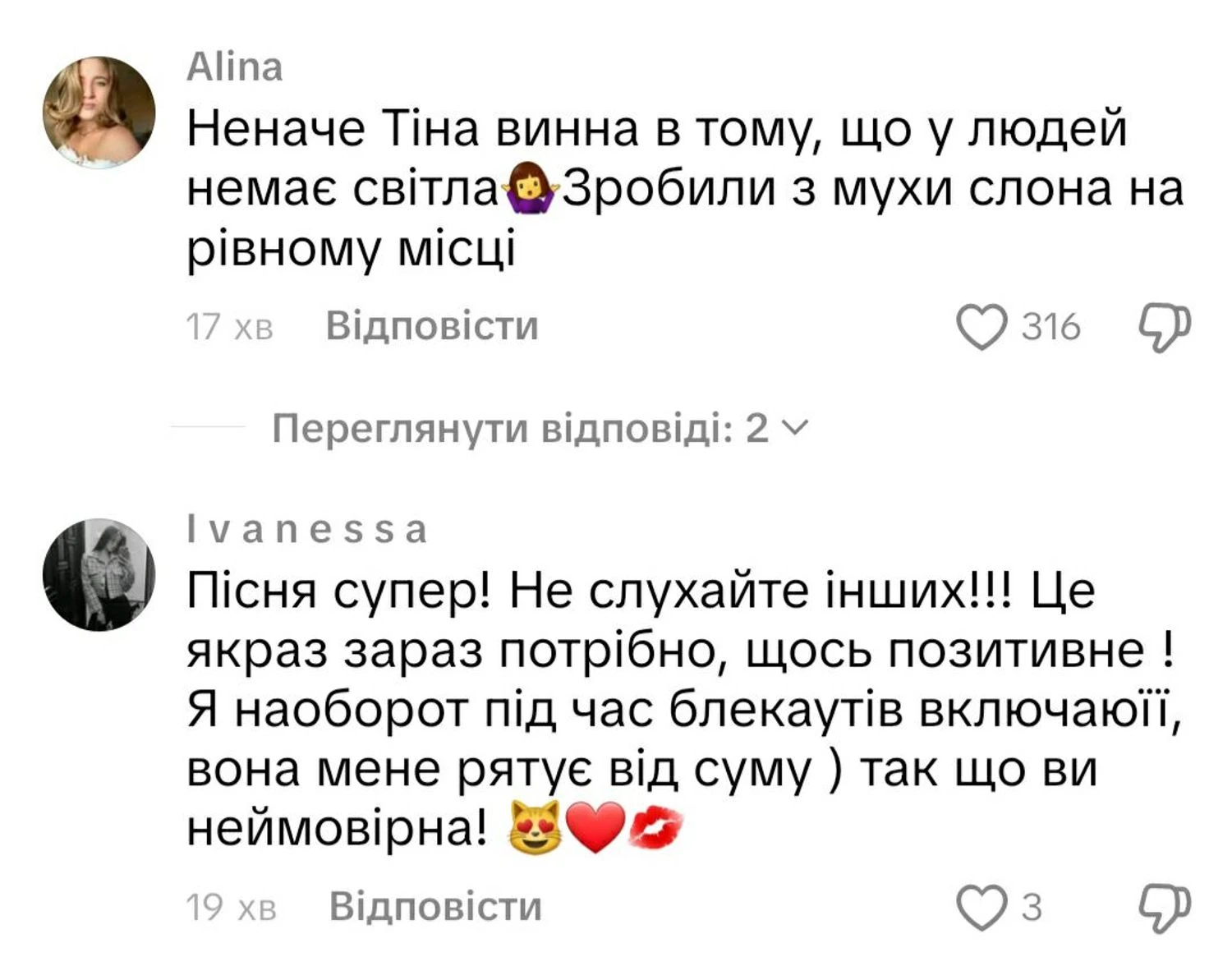 Відома українська співачка Тіна Кароль оприлюднила нову пісню в TikTok зі словами "У нас немає світла, та в нас є тепло. У нас немає тепла, та в нас є добро". Ця пісня викликала активні дискусії у соцмережах.