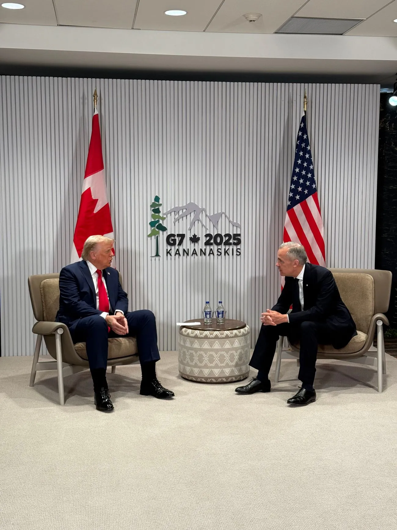 Помічник Білого дому опублікував фотографію президента та канадця Карні, які сидять та розмовляють без присутності ЗМІ, коли саміт розпочався в Канадських Скелястих горах.
