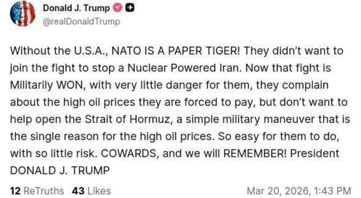 Без США НАТО - це боягузи, паперовий тигр. Вони не захотіли брати участь у боротьбі з Іраном, тепер скаржаться на високі ціни на нафту, але не допомагають відкрити Ормузьку протоку - це ж простий військовий маневр. Ми це запам'ятаємо
