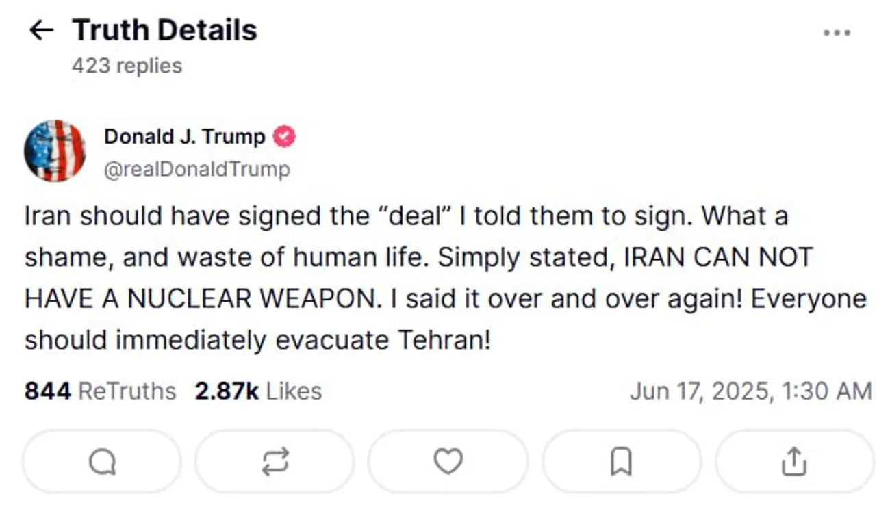 "Яка жалість, яка трата людських життів. Простіше кажучи, Іран не може мати ядерну зброю. Я повторював це знову і знову! Усі мають негайно евакуюватися з Тегерана!" - йдеться у дописі Тампа.