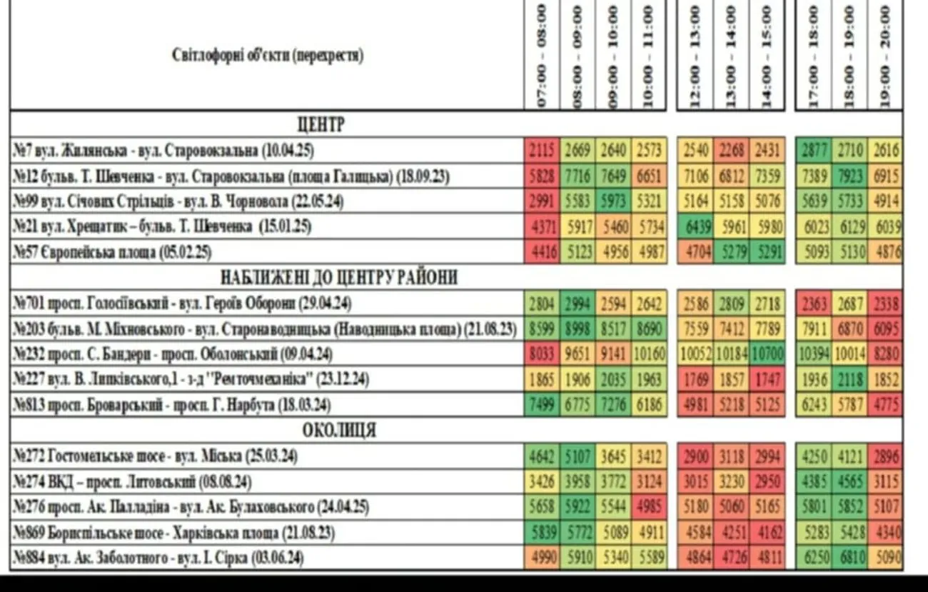 Зазначається, що дані подано як сумарну середньомісячну добову інтенсивність руху по 10-ти світлофорних об’єктах (СО).