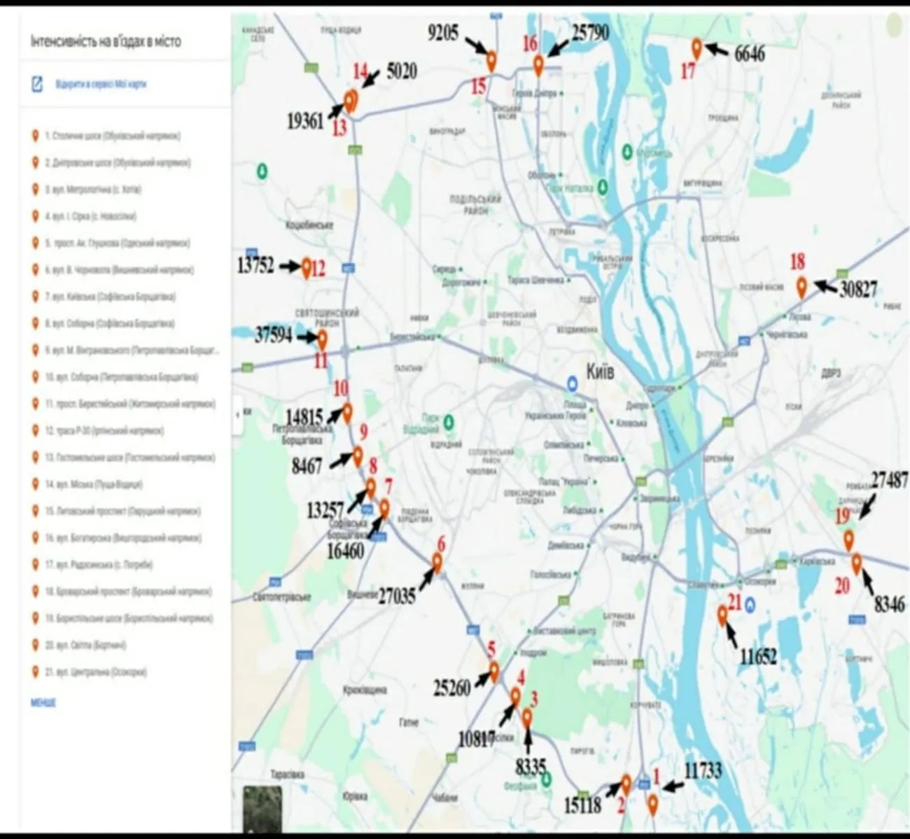 У березні 2025 року здійснювався підрахунок інтенсивності транспортних засобів на в’їздах до Зони паркування 3 м. Києва (рис. 1). За результатами, найбільш завантаженими напрямками (в одному напрямку руху) є: Житомирський, Броварський, Бориспільський, Вишневський, Вишгородський, Одеський та Гостомельський