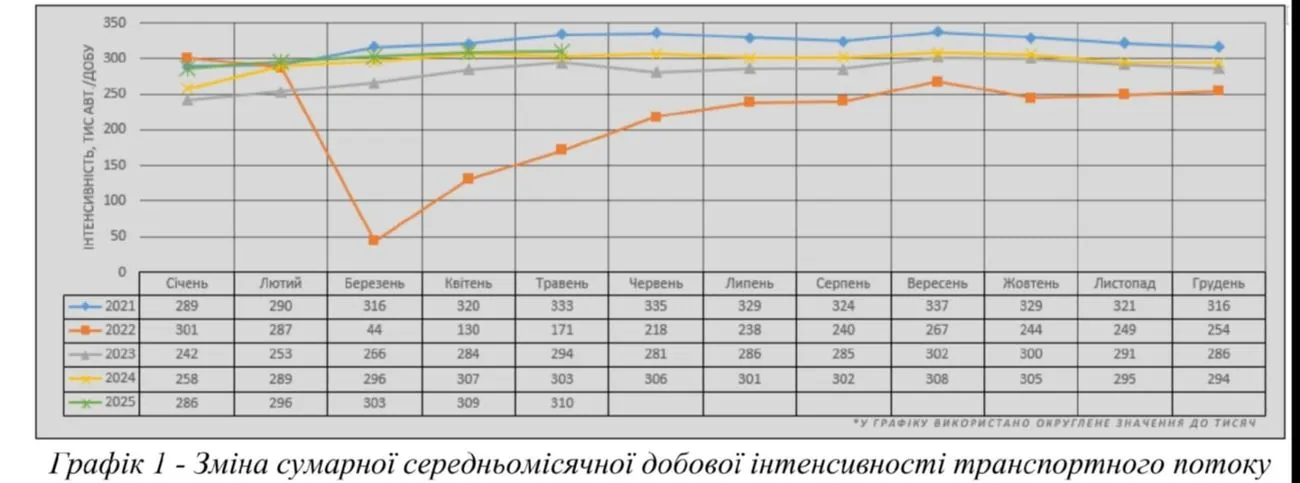 "Сезонна кореляція простежується: інтенсивність транспортного потоку зростає навесні та на початку осені, а зменшується взимку. Найвища інтенсивність зазвичай спостерігається у вересні, а найнижча у січні. Це чітко видно на графіку 1, де зображено зміну інтенсивності руху транспортних засобів на вулично-дорожній мережі міста з січня 2021 по травень 2025 року", - йдеться у відповіді на запит.