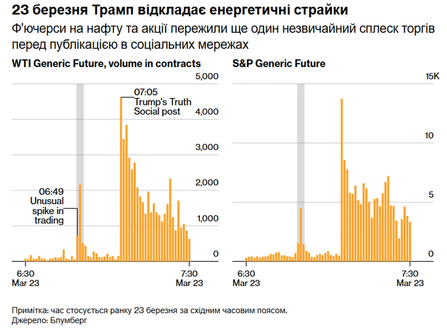 Подібна ситуація була і 23 березня - за хвилини до заяви про відкладення ударів по іранській енергетичній інфраструктурі відбулися масштабні угоди на нафтовому та фондовому ринках.