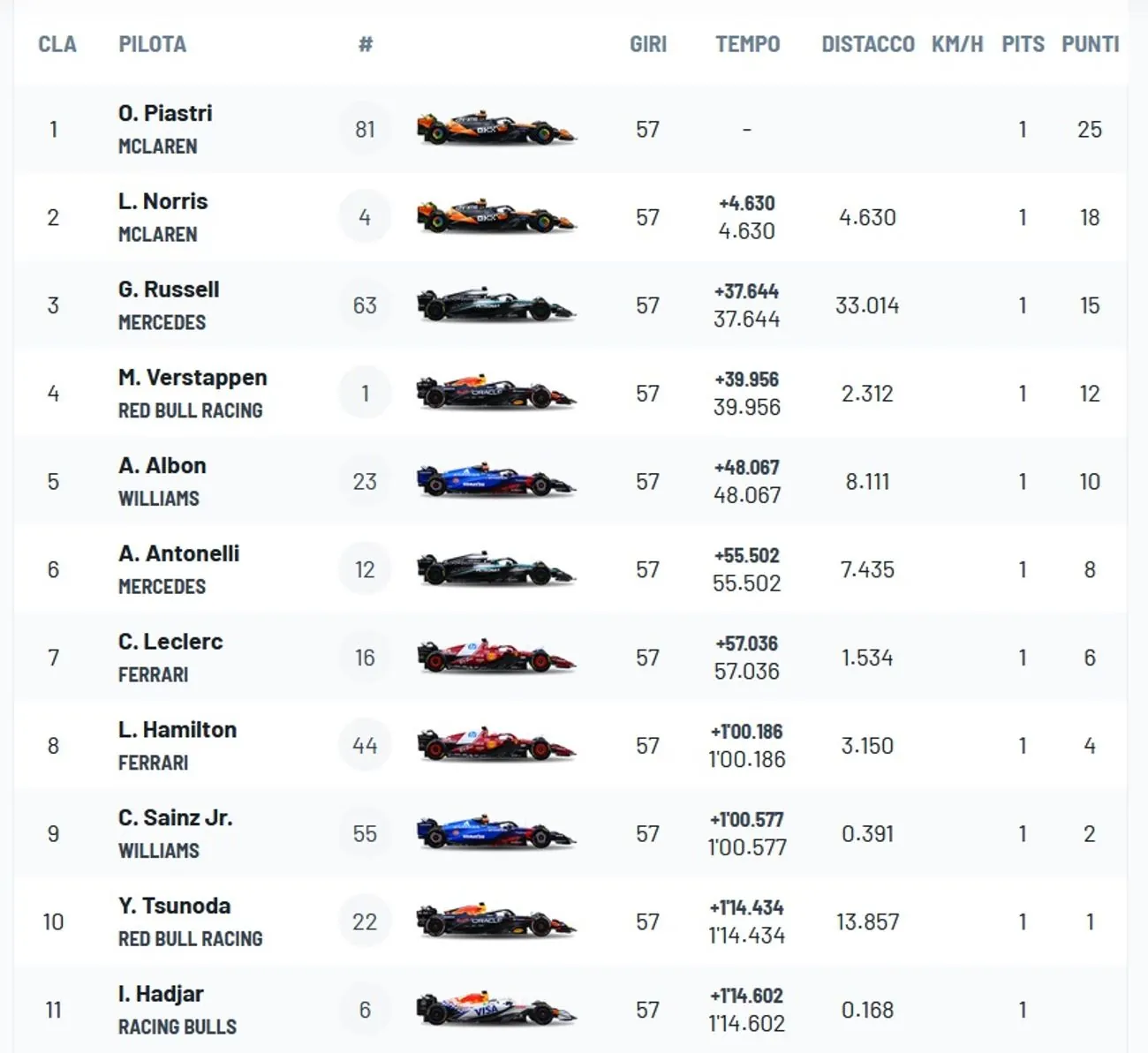 Піастрі повною мірою скористався хаосом на першому колі, через що його товариш по команді Лендо Норріс втратив багато позицій. Потім Піастрі перехитрив Кімі Антонеллі та Макса Ферстаппена, після чого австралієць здобув безперечну перемогу.