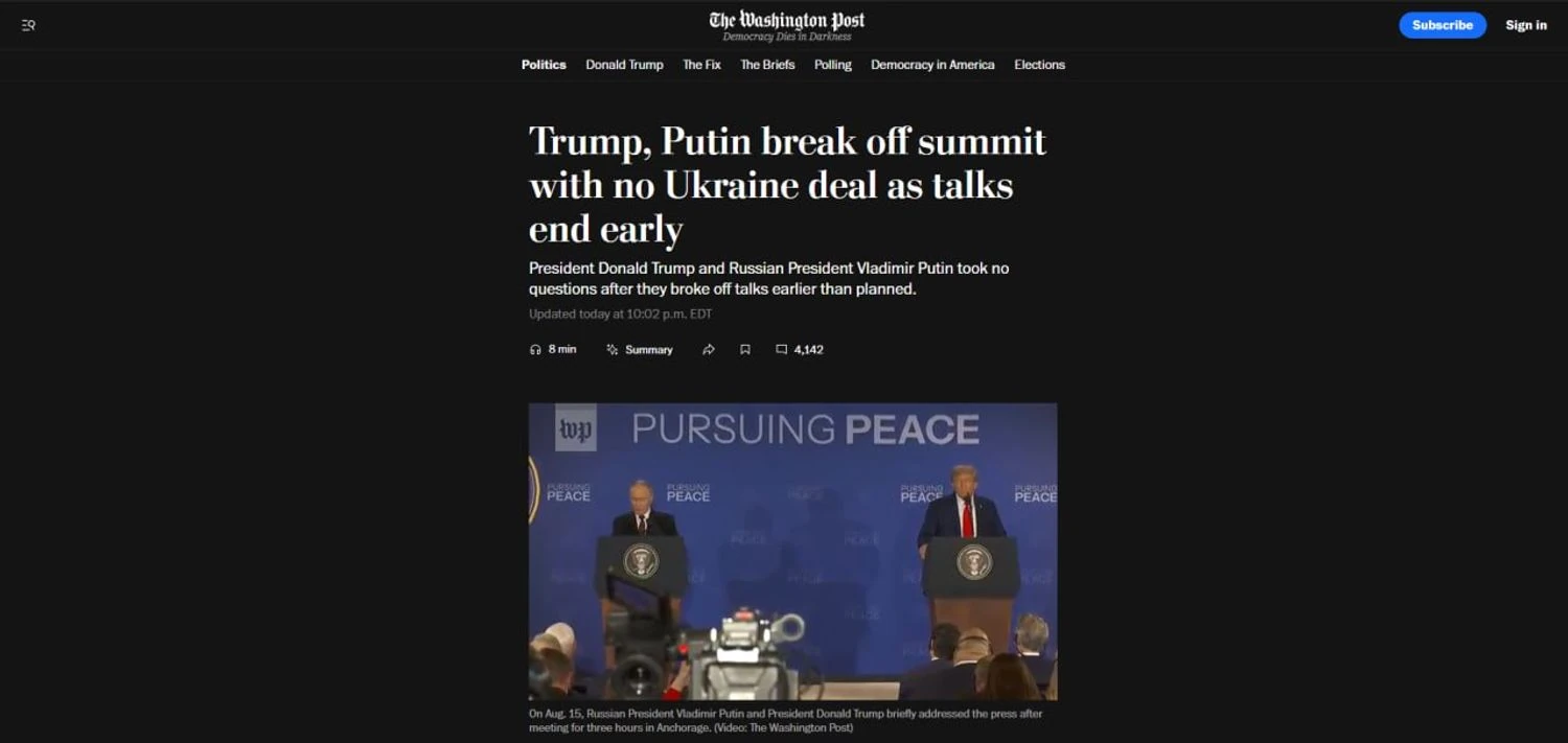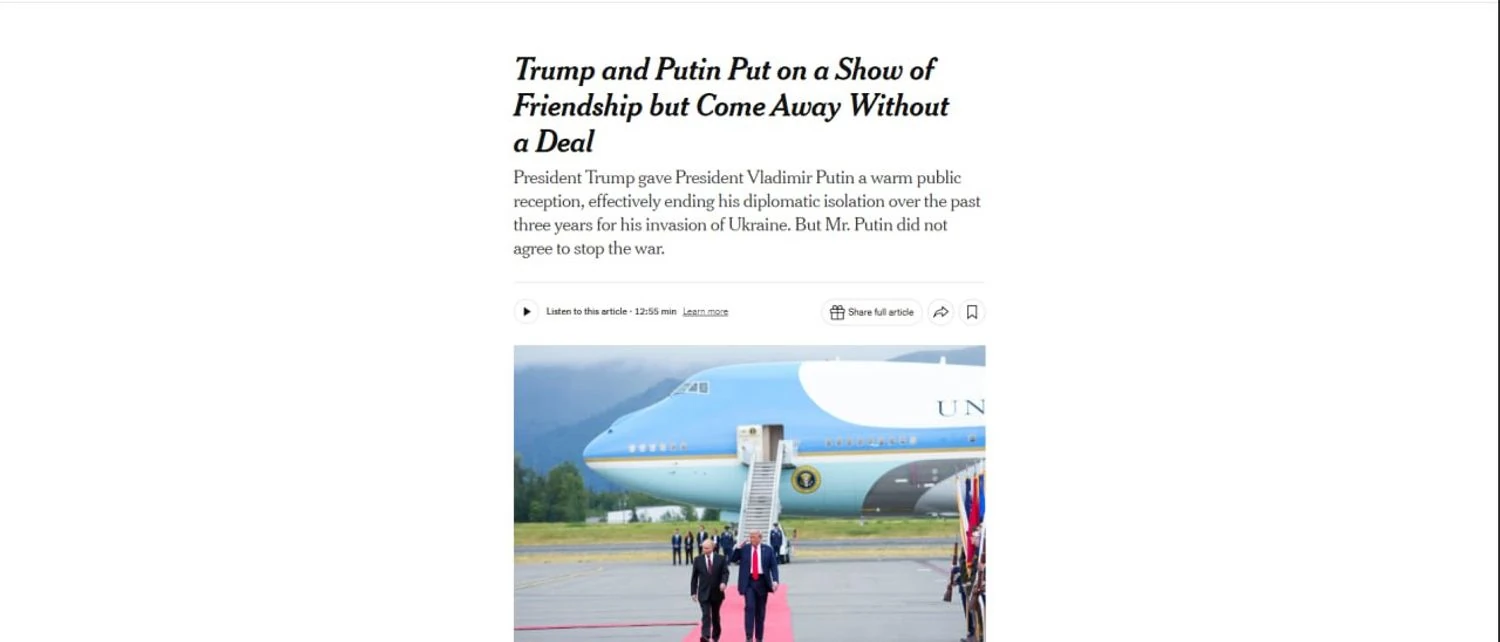 Провідні західні медіа визнали «тріумф Путіна на Алясці» та «теплу зустріч» з Трампом. Переговори завершилися без угоди щодо України та припинення вогню.