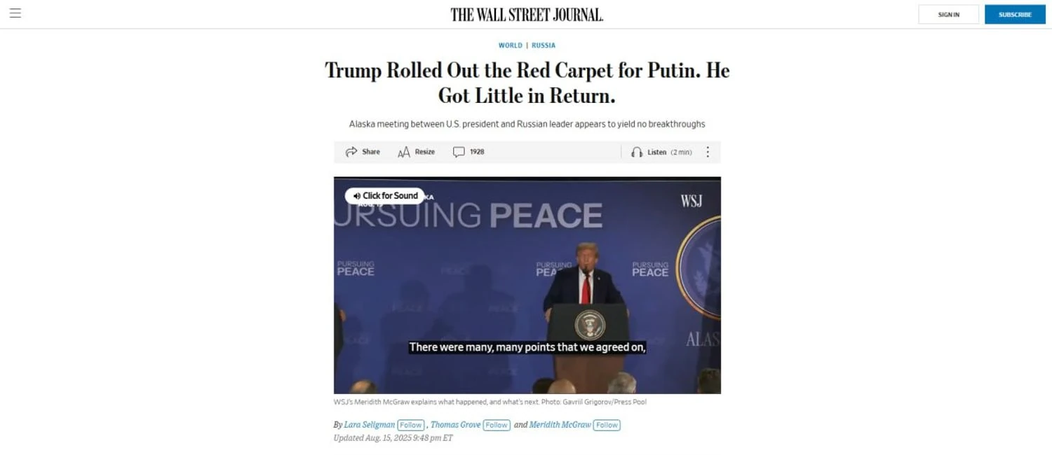 "Трамп розстелив червону доріжку для путіна. Натомість отримав мало", - написало The Wall Street Journal.
