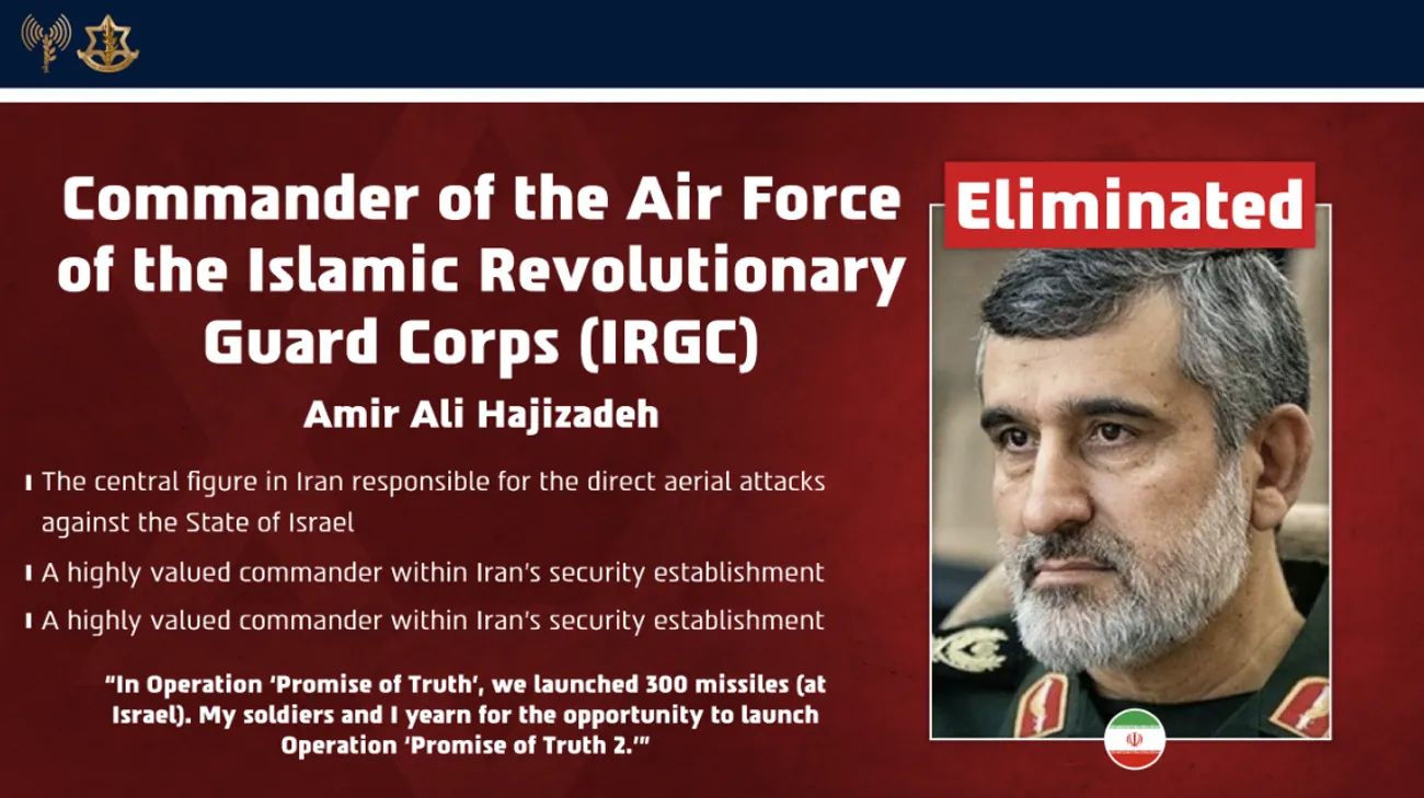 Вночі ЦАХАЛ завдав удару по командному центру КВІР, де знаходився командувач ВПС Корпусу вартових ісламської революції. Разом з ним ліквідовано інших командирів, які керували атаками на Ізраїль та Саудівську Аравію.