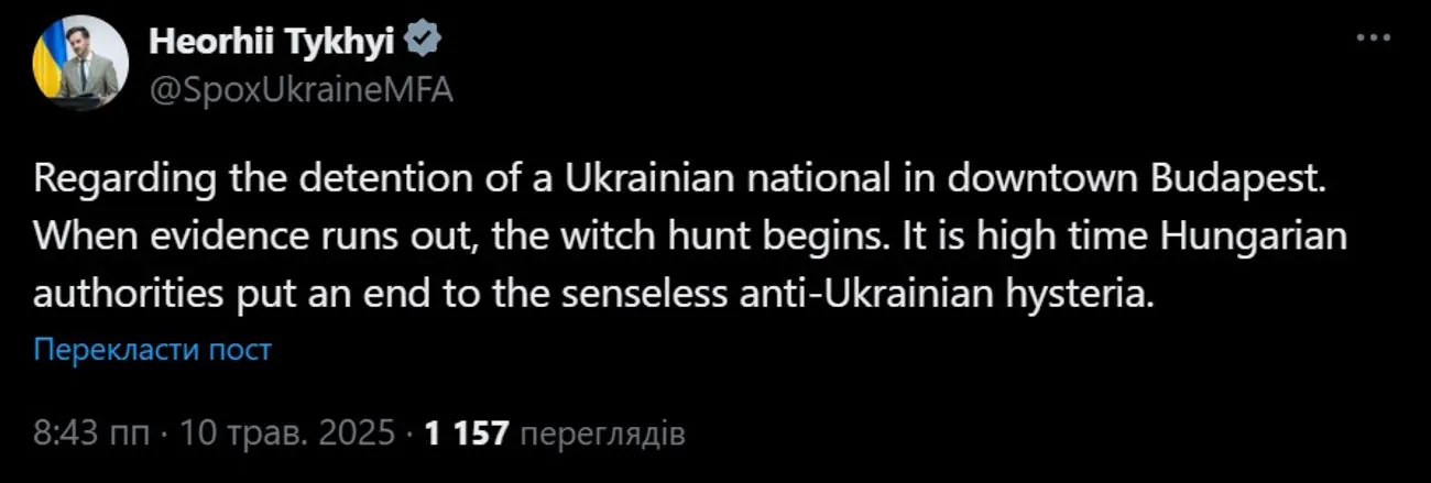 Міністерство закордонних справ України відреагувало на затримання в Будапешті колишнього працівника українського посольства. Про це написав у соцмережі "Х" речник МЗС Георгій Тихий, передає УНН.
