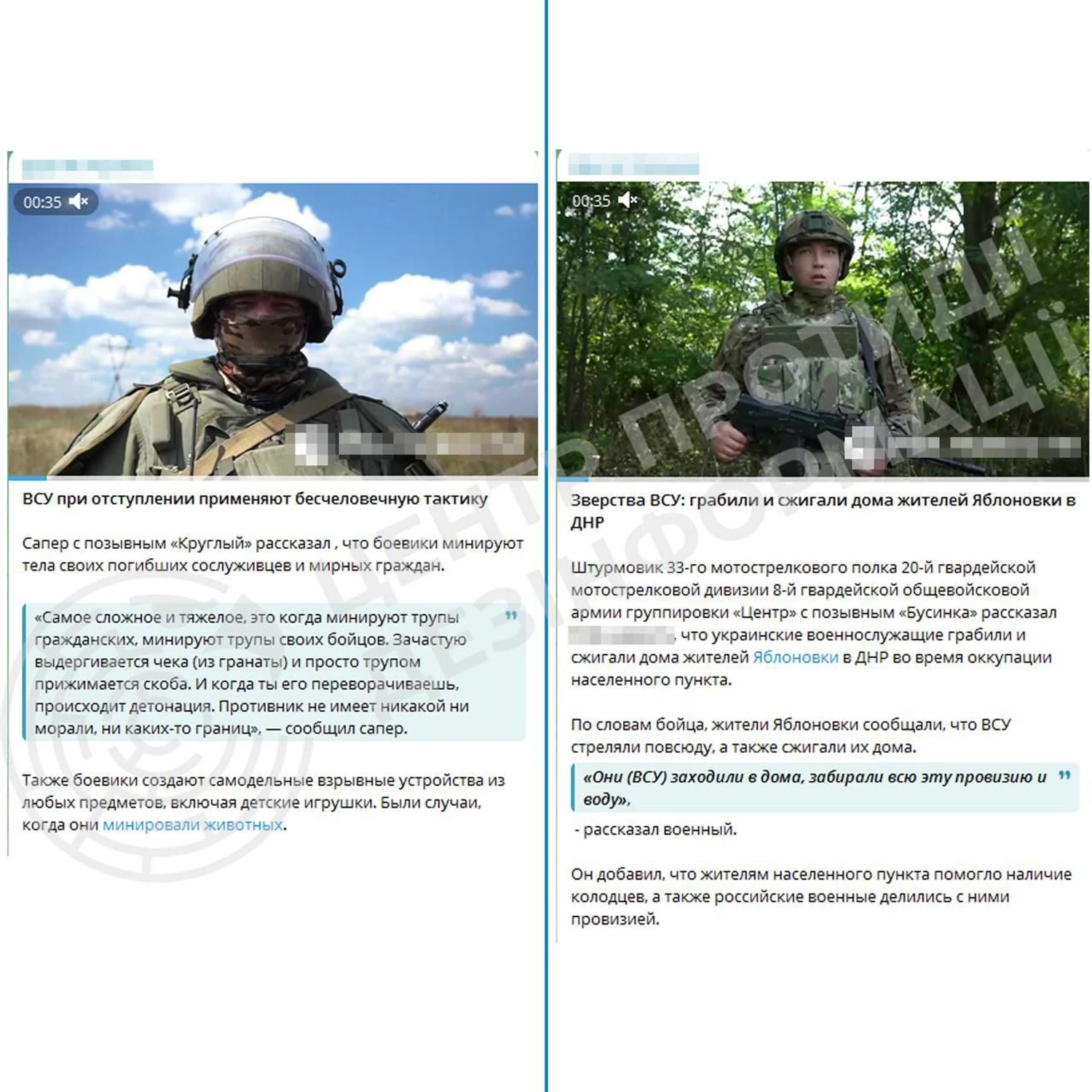 Зазначається, що у прокремлівських медіа з’явилися "свідчення" російських військових, що нібито ЗСУ "грабують та спалюють будинки" жителів Яблунівки Донецької області. Також поширюється дезінформація, що під час відступу українські військові нібито "мінують тіла загиблих цивільних і своїх бійців".