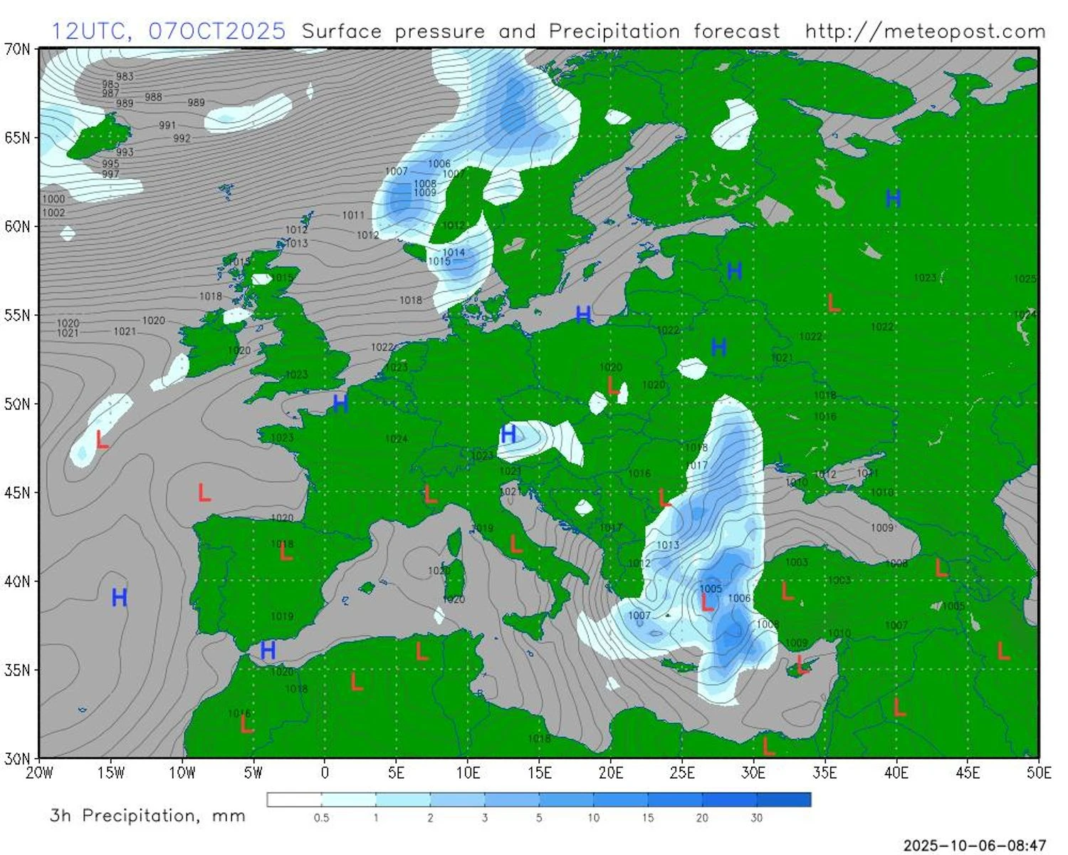 7 жовтня циклон із атмосферними фронтами спричинить дощі в Одеській, Вінницькій, Тернопільській та Хмельницькій областях. Температура повітря коливатиметься від +9°C на заході до +21°C на півдні та сході.