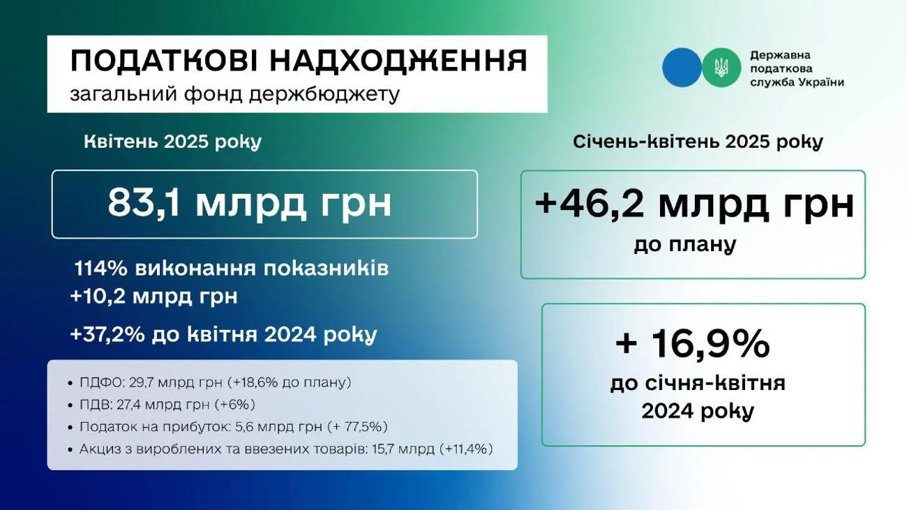 У квітні 2025 року до держбюджету надійшло понад 83 млрд грн податків, що на 14% більше плану. Загалом за січень-квітень план перевиконано на 46,2 млрд грн.