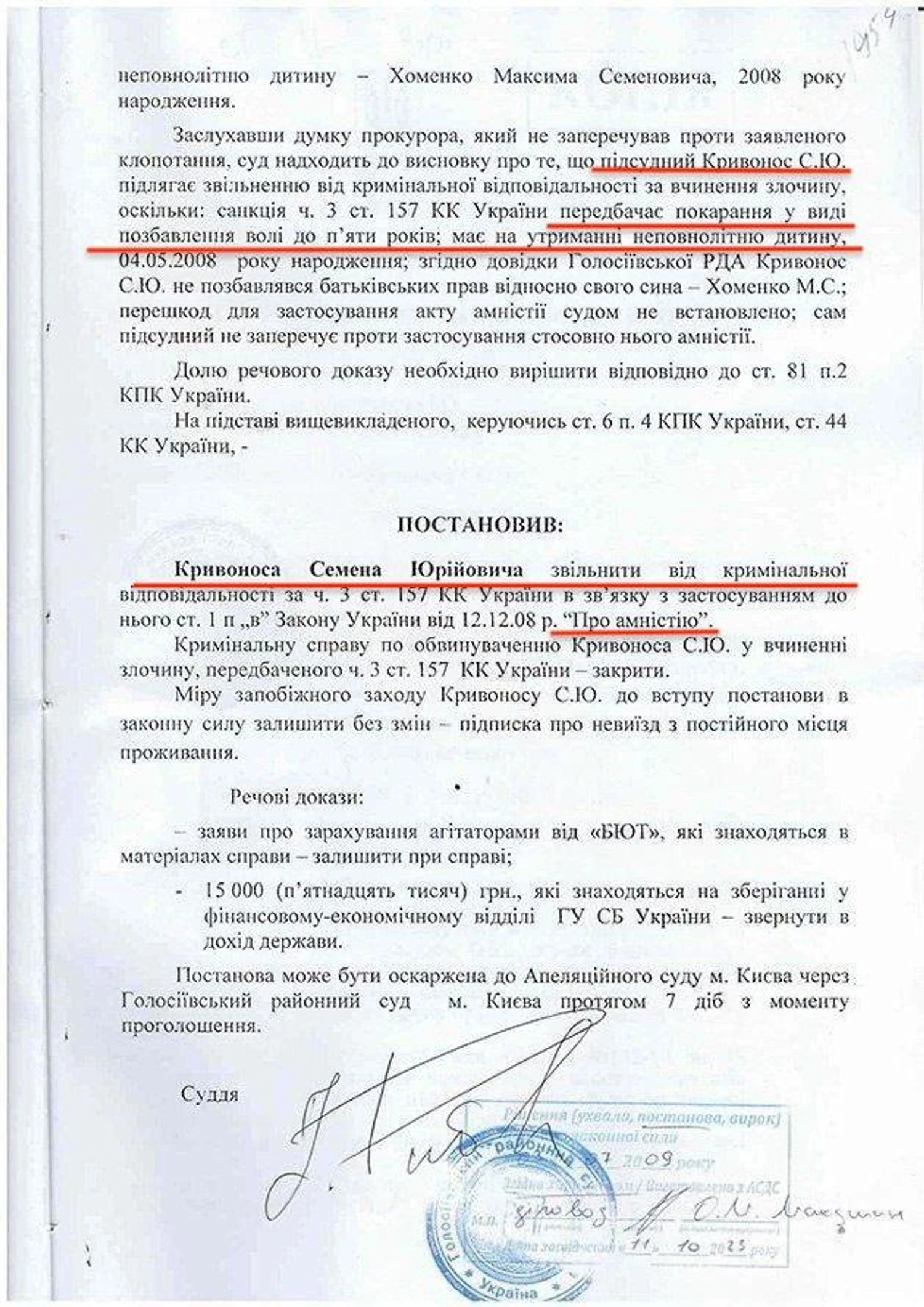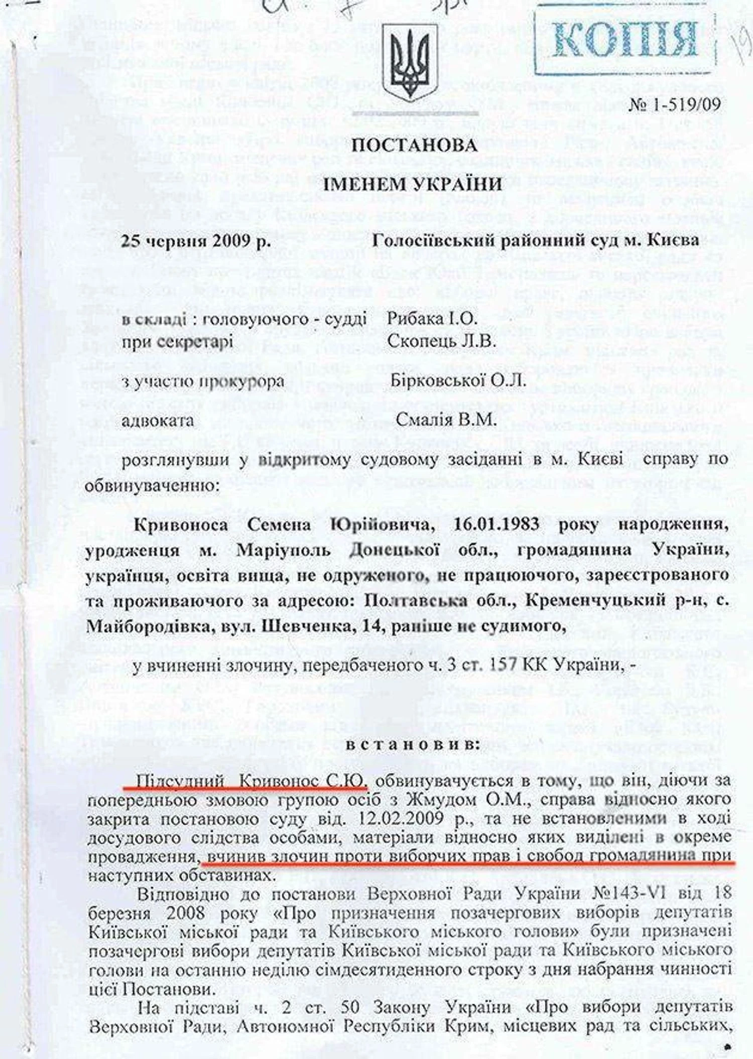 Видання нагадало, що директор НАБУ Семен Кривонос отримав обвинувальний судовий вирок у справі щодо підкупу виборців на користь Блоку Юлії Тимошенко. Проте у червні 2009 року був звільнений по амністії через наявність у нього малолітньої дитини. За інформацією ЗМІ, він нібито всиновив хлопчика і завдяки цьому уникнув ув’язнення.
