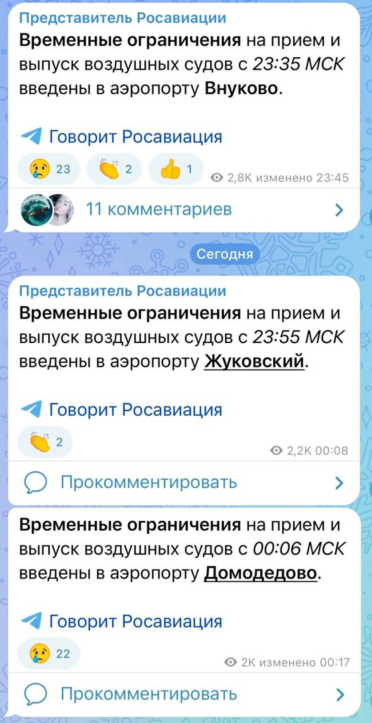 У четвер, 22 травня о 23:45 (за Київським часом) представник "Росавіації" повідомив в Telegram про призупинення роботи аеропорту "Внуково", пізніше – аеропортів "Жуковський" і "Домодєдово".