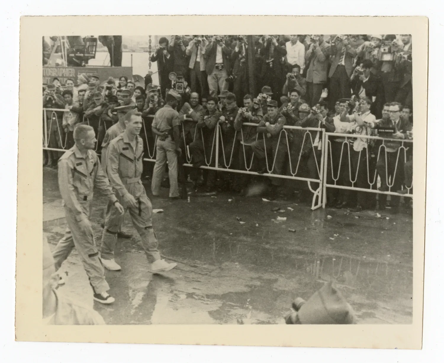 Фото зробив військовий фотограф Рон МакКвіні під час рятувальної операції після екстреного приводнення біля Японії. На кадрах зафіксовано Армстронга та Девіда Скотта одразу після порятунку.