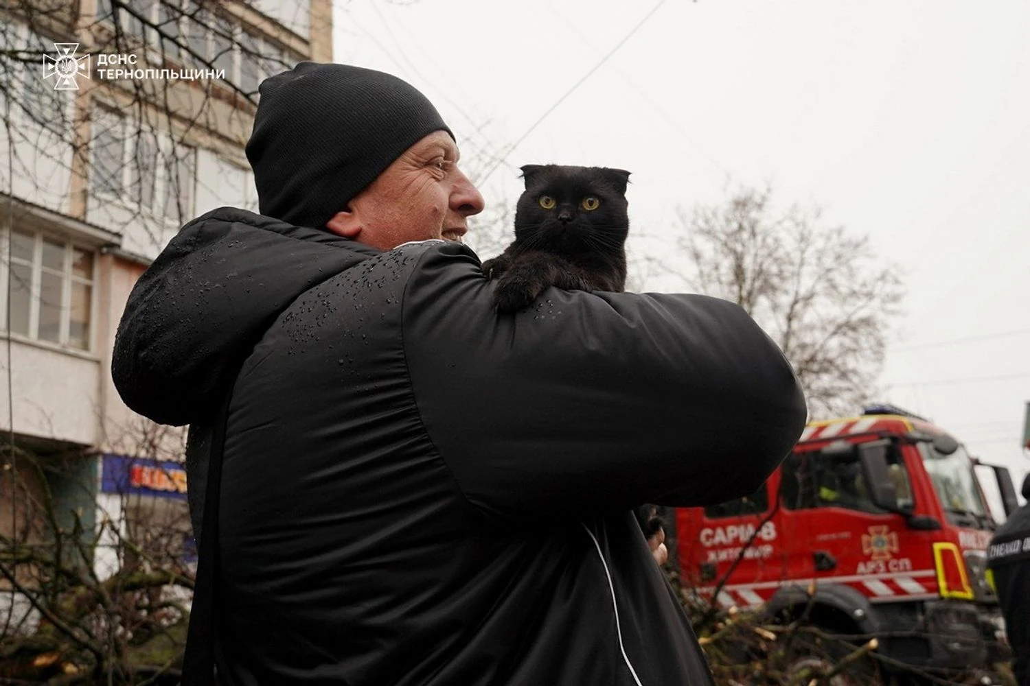 У зруйнованому ракетним ударом будинку в Тернополі рятувальники ДСНС знайшли двох котів живими