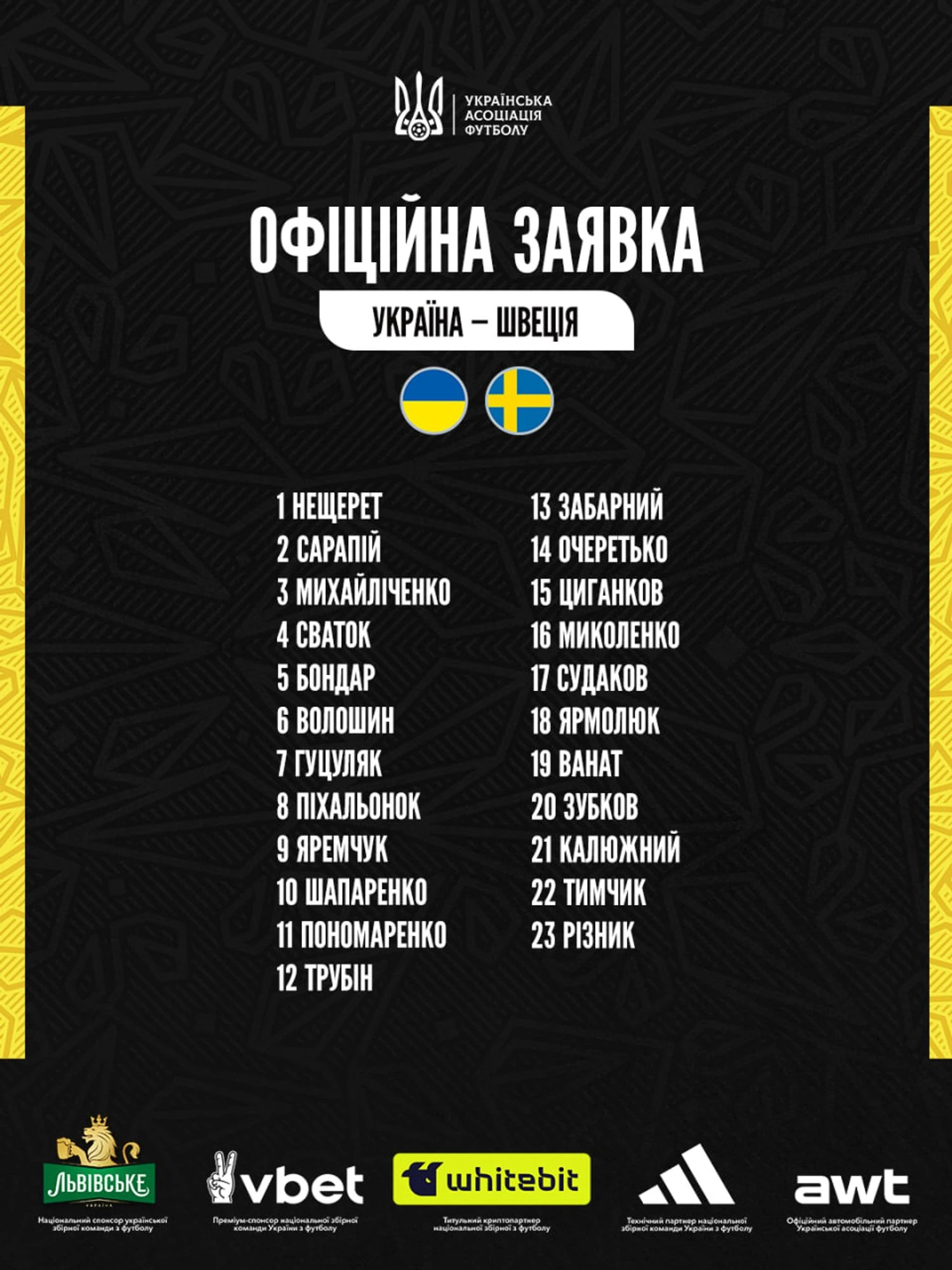 Україна оголосила офіційну заявку на поєдинок плей-оф кваліфікації до Чемпіонату світу 2026 року проти збірної Швеції. Також оголошено склад української національної збірної, повідомляє УНН з посиланням на Українську асоціацію футболу.