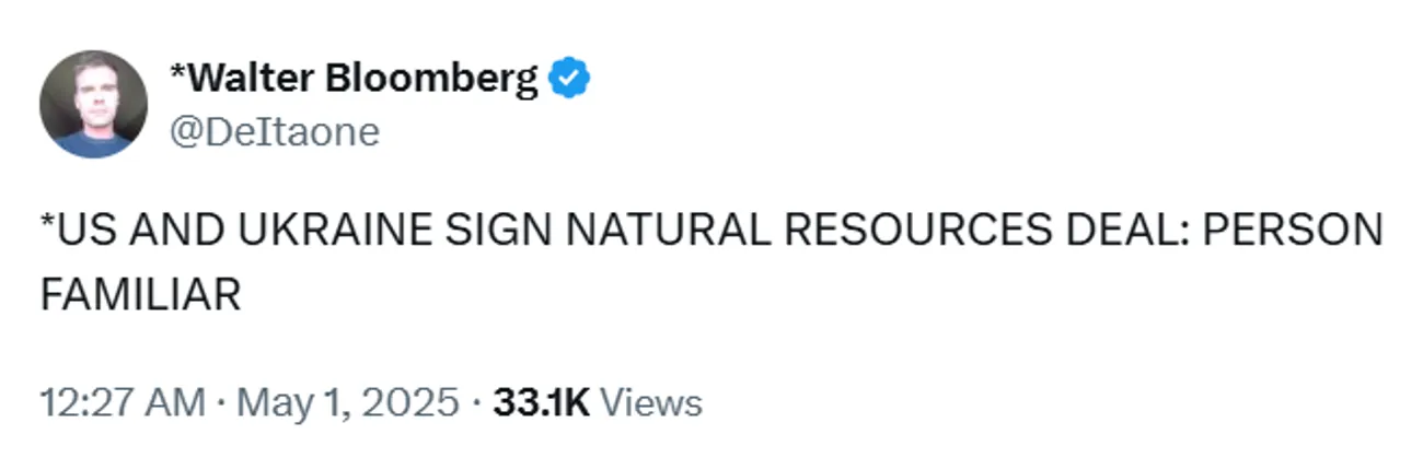 США та Україна уклали угоду щодо природних ресурсів, про це повідомив журналіст Bloomberg у соціальній мережі X, посилаючись на власне джерело.