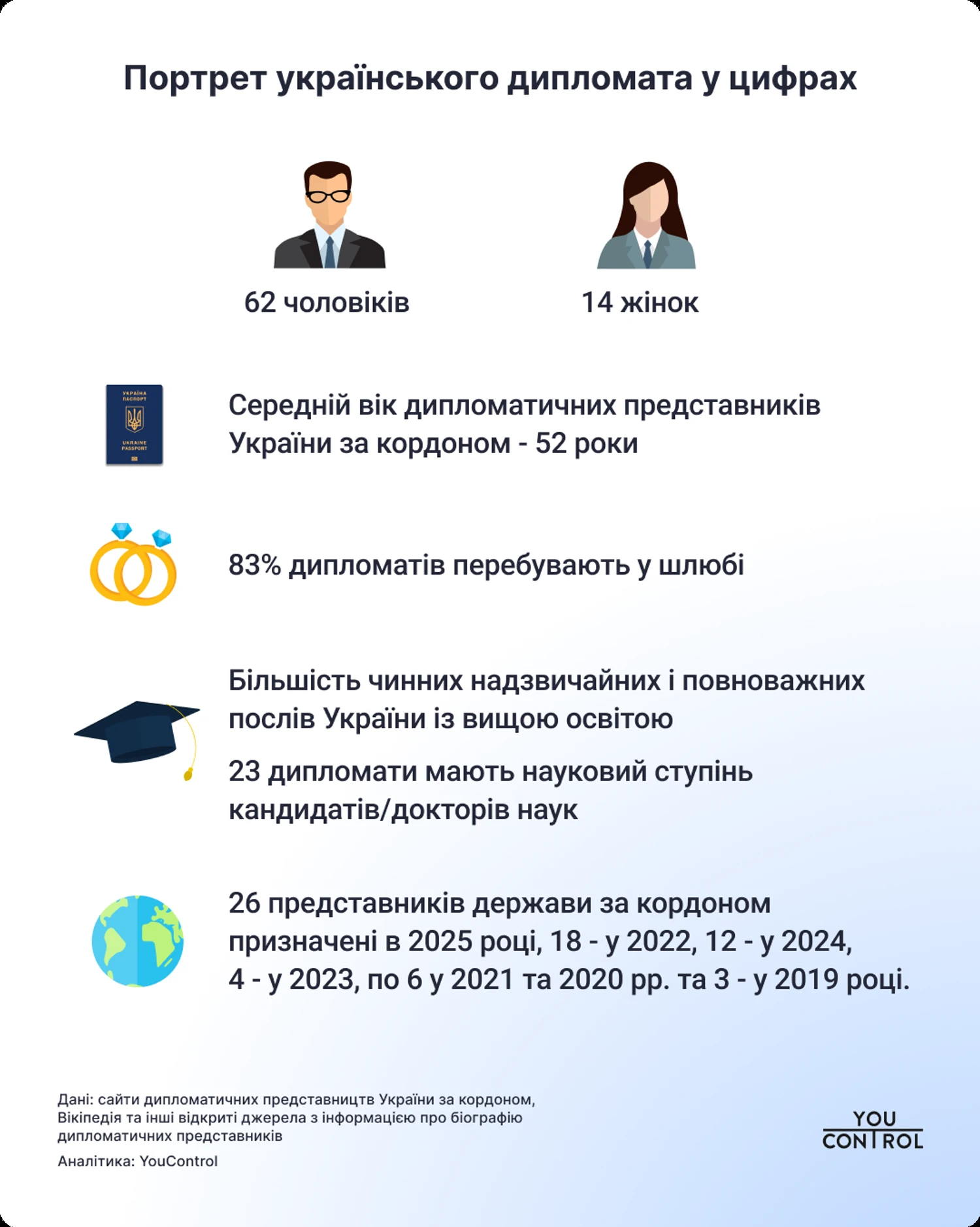 Інтереси України за кордоном представляють 76 чинних надзвичайних і повноважних послів, 17 з яких були призначені наприкінці липня 2025 року. Середня річна зарплата дипломатичного представника, куди входять компенсаційні виплати як частина Фонду оплати праці, у 2024 році становила 2,95 млн грн, повідомляє УНН з посиланням на YouConrtol.