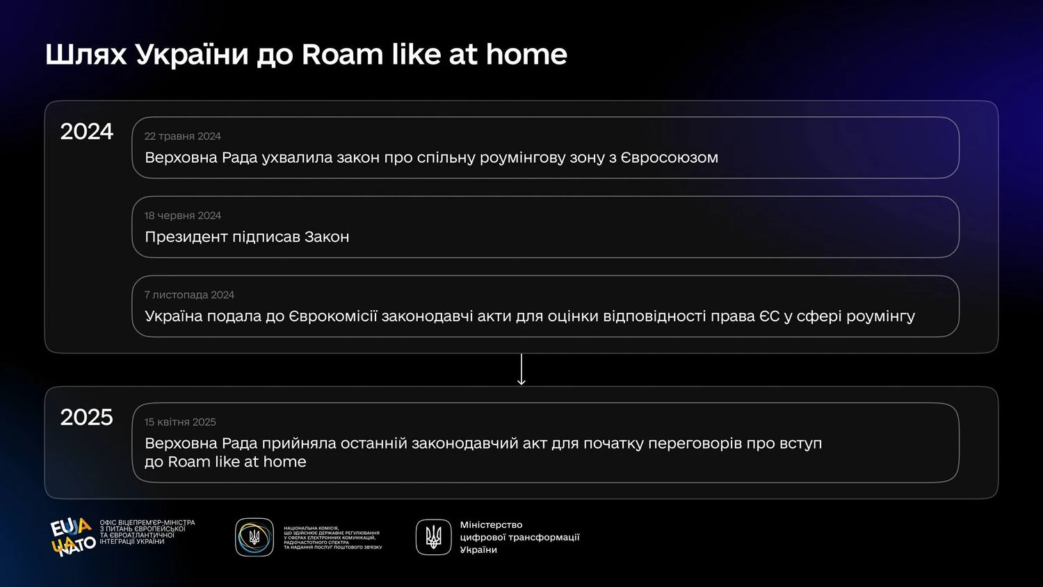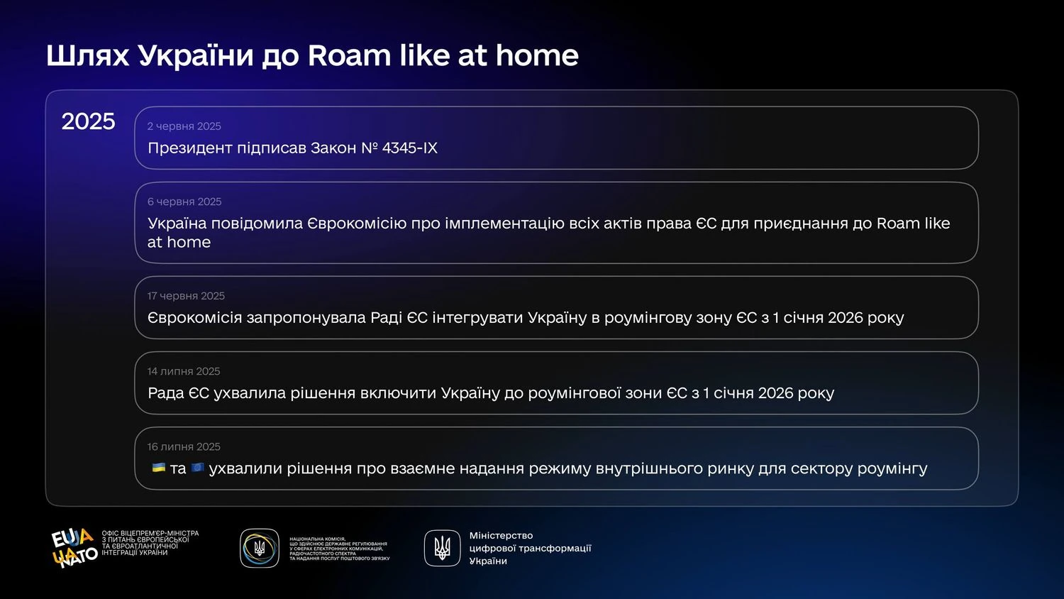 У парламенті вказали, що 1 січня 2026 року вводиться в дію закон №4345-IX про "цифровий безвіз", який приєднує Україну до політики ЄС "Roam Like at Home". До національного законодавства імплементуються європейські правила роумінгу, що створює "цифровий міст" між Україною та ЄС.