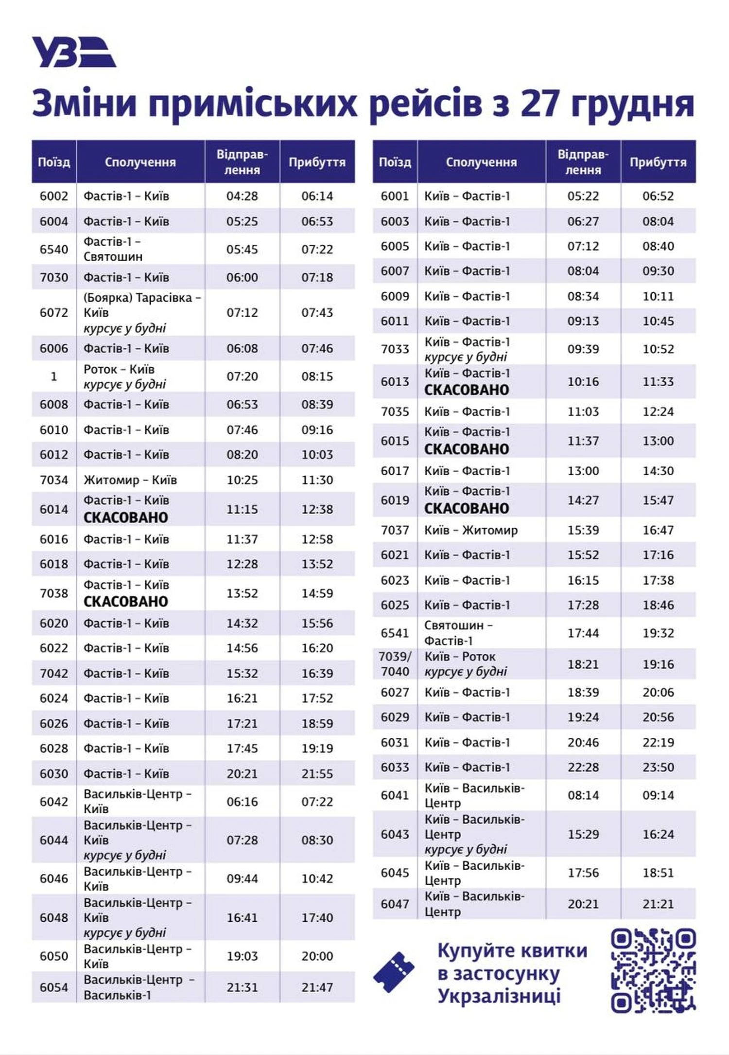 З 27 грудня тимчасово скасовано 5 денних рейсів із найнижчим пасажиропотоком. Водночас основні напрямки на Київ, Козятин, Житомир та Білу Церкву зберігаються. Для компенсації дефіциту місць столичні електрички курсуватимуть у посиленому складі – по 8 та 10 вагонів.