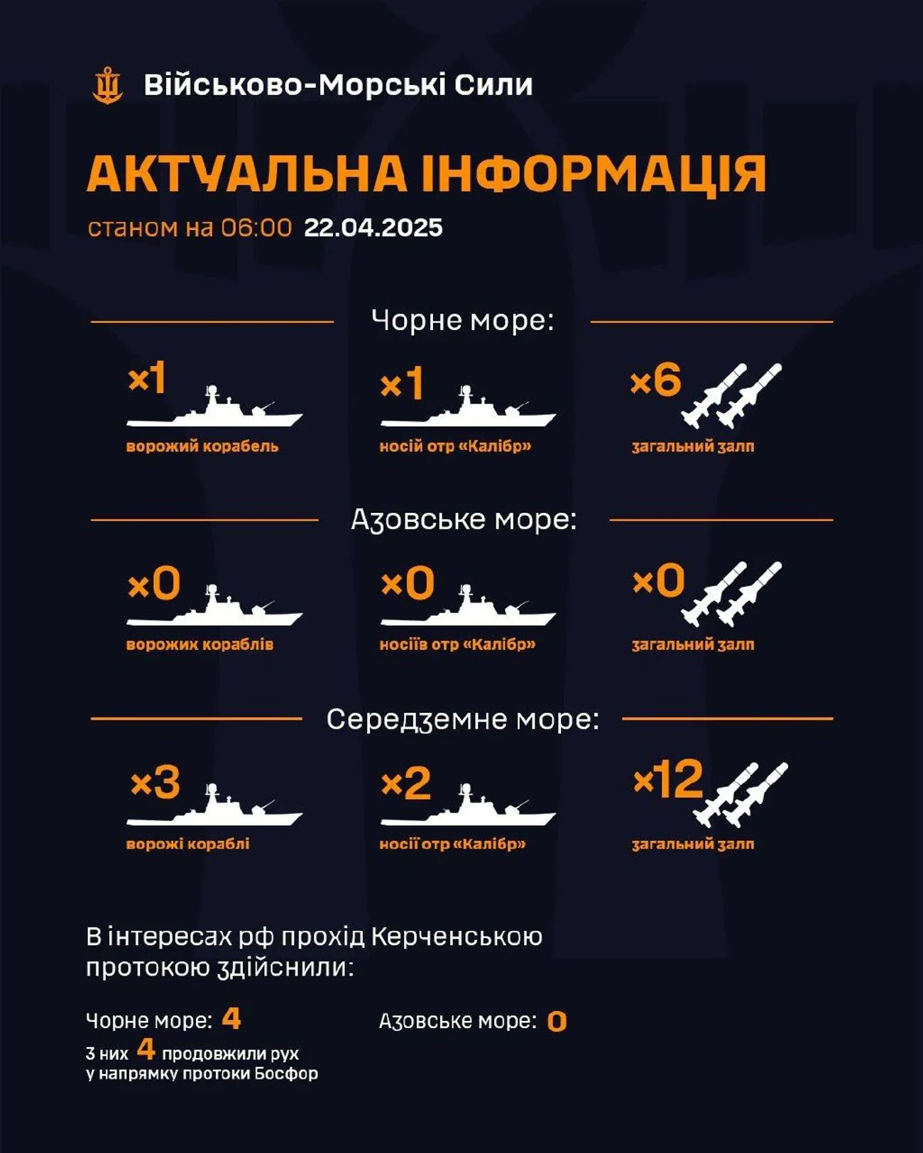Зазначається, що станом на 06:00 22.04.2025 в Чорному морі зафіксовано ворожий корабель, який є носієм крилатих ракет типу "Калібр" із загальним залпом до 6 ракет. В Середземному морі також триває чергування російських ракетоносіїв.