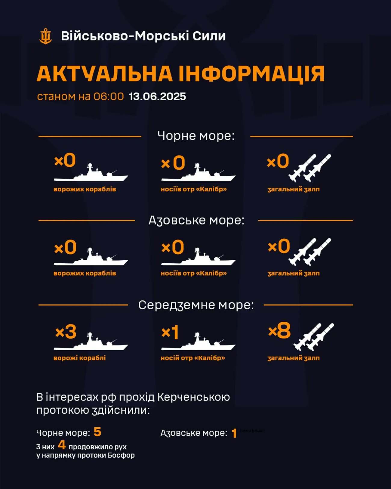 За даними ВМС ЗСУ, 13 червня 2025 року в Чорному та Азовському морях відсутні ворожі кораблі. В Середземному морі перебуває 3 кораблі рф, один з них з "Калібрами".