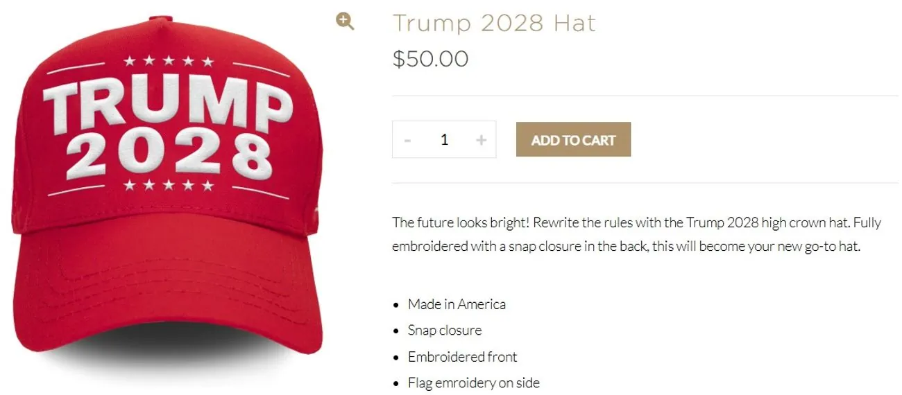 В онлайн-магазині Дональда Трампа з'явилися кепки та футболки з написом "Trump 2028". Це може свідчити про намір Трампа балотуватися на третій термін.