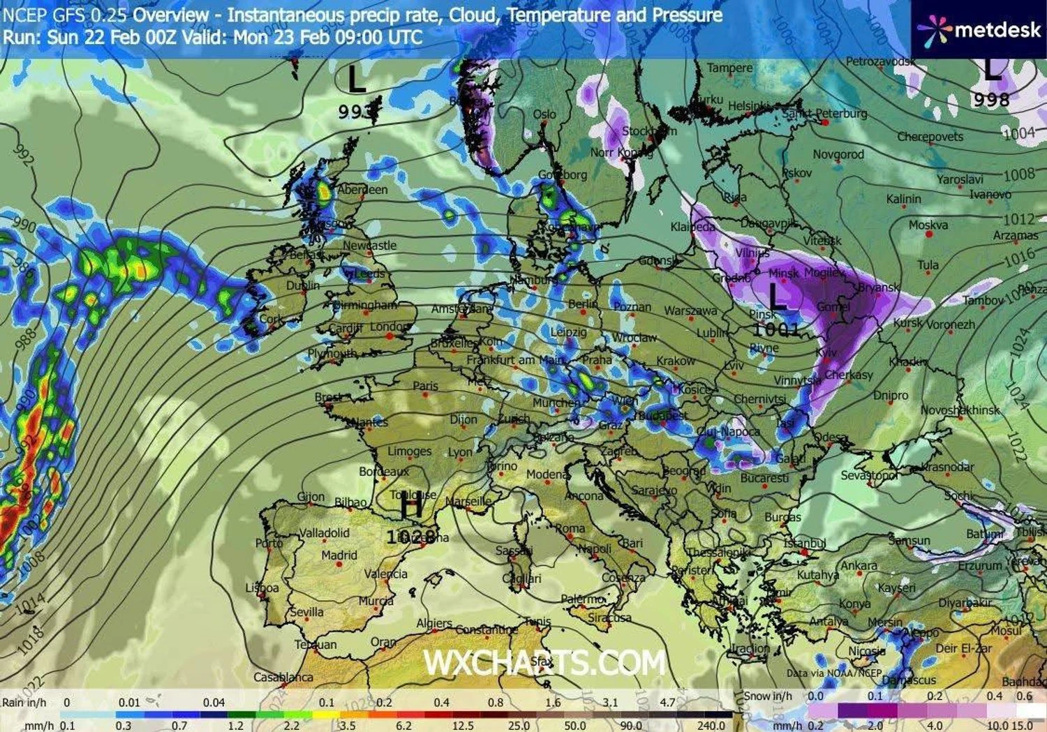 У понеділок, 23 лютого, в Україні очікується відносне потепління, проте погоду ускладнять дощі, мокрий сніг та сильний вітер. Температура повітря вночі коливатиметься від -3 до +3 градусів, вдень - від -1 до +8 градусів.