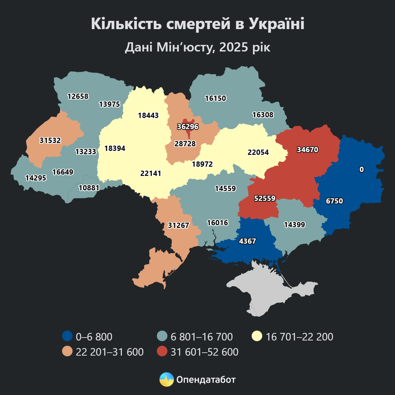 Найбільше смертей зафіксовано на Дніпропетровщині (52 559), у Києві (36 296) та на Харківщині (34 670).