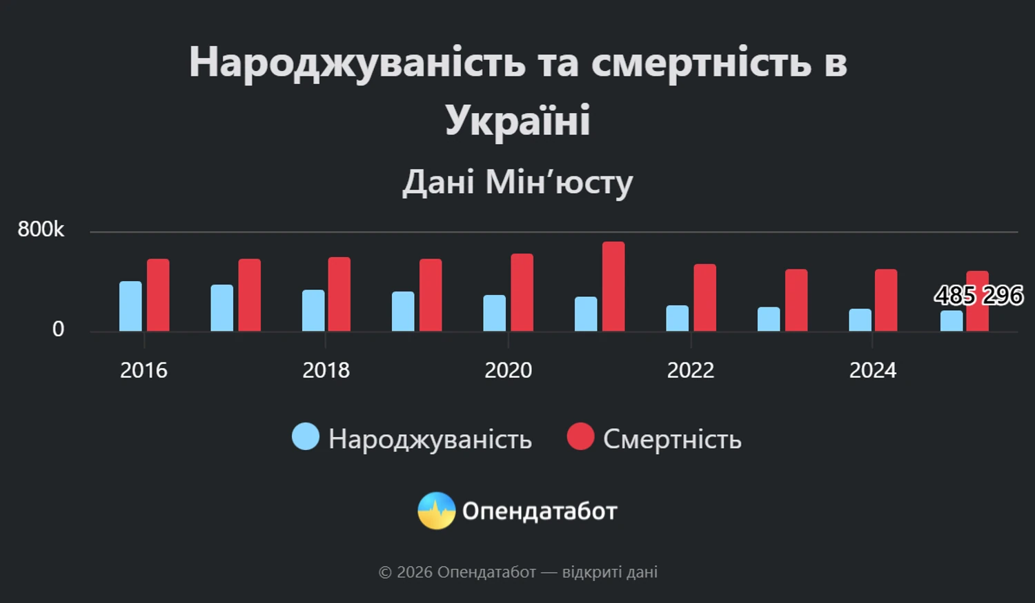 У 2025 році в Україні було зафіксовано 485 296 смертей. Загалом смертність по країні зменшилася на 2%. Наразі на одного новонародженого припадає троє померлих.