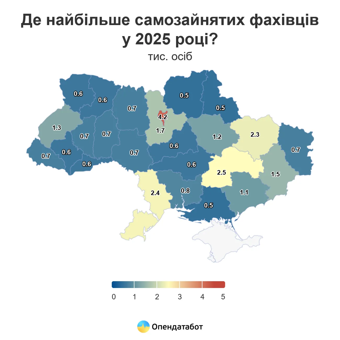 Найбільше таких фахівців працює у Києві - 4,2 тис. Далі - Дніпропетровщина - 2,5 тис. та Одещина - 2,4 тис.
