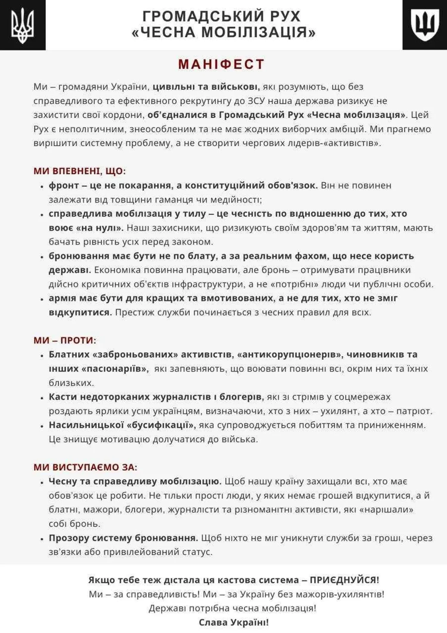 "Ми - проти: блатних "заброньованих" активістів, "антикорупціонерів", чиновників та інших "пасіонаріїв", які запевняють, що воювати повинні всі, окрім них та їхніх близьких. Проти касти недоторканих журналістів і блогерів, які зі стрімів у соцмережах роздають ярлики усім українцям, визначаючи, хто з них – ухилянт, а хто – патріот. Проти насильницької "бусифікації", яка супроводжується побиттям та приниженням. Це знищує мотивацію долучатися до війська", - зазначається в Маніфесті.