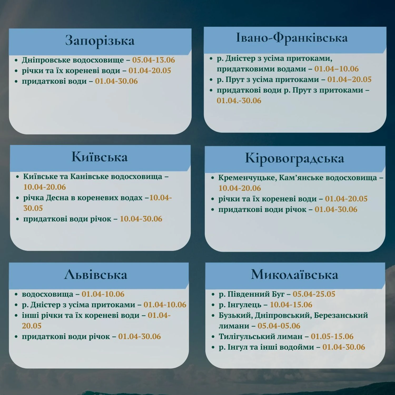Терміни нерестової заборони в різних регіонах можуть відрізнятися. Вони залежать від особливостей водойм та умов у конкретній області.