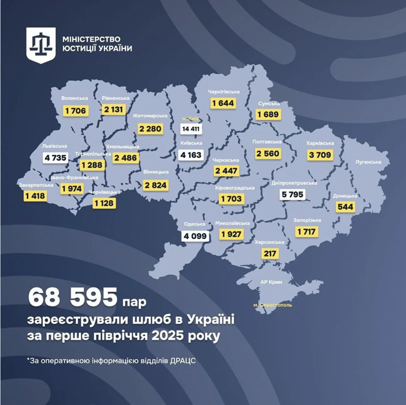 За перше півріччя 2025 року в Україні зареєстровано 68 595 шлюбів, з них 14 411 у Києві. Це на 6% менше, ніж за аналогічний період 2024 року, але на 15% більше, ніж за 2023 рік.