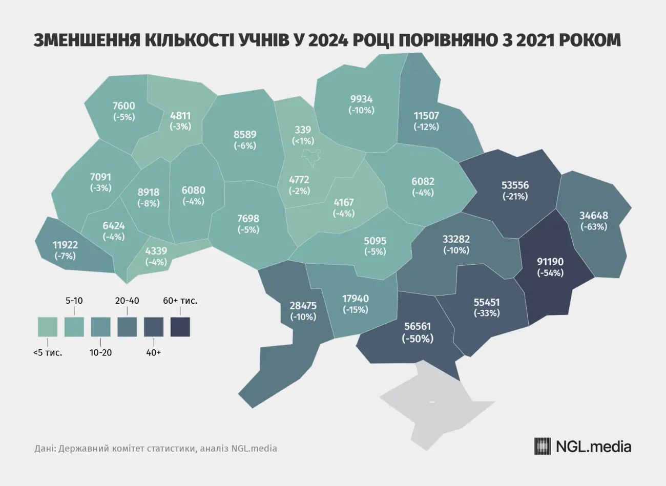 За результатами аналізу NGL Media на основі даних Міносвіти про кількість учнів 8-12 класів за 2021-2025 роки, які переходили у 9-й клас, 10-й і далі, є тенденція, що кілька відсотків учнів (2-4%) щороку не переходять у наступний клас, тобто покидають школу. Це не обов’язково означає, що всі ці діти виїхали з України, але значна частина з них – напевно.